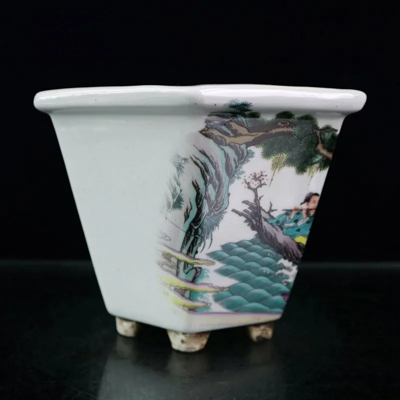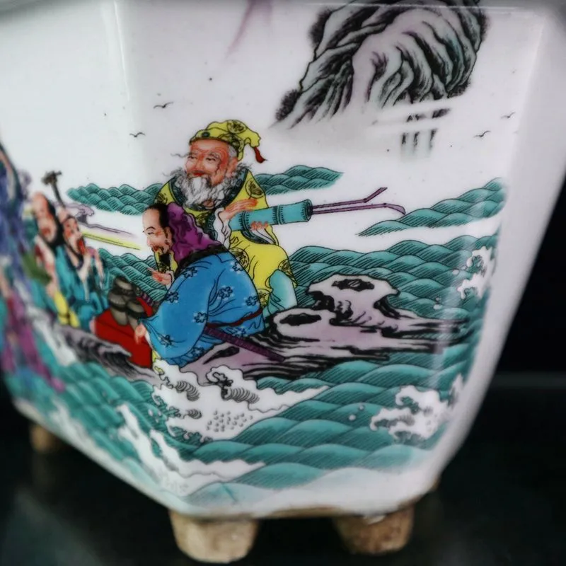 Шесть квадратных цветочных горшков китайского старого фарфора, пастельные Восемь Бессмертных картин,