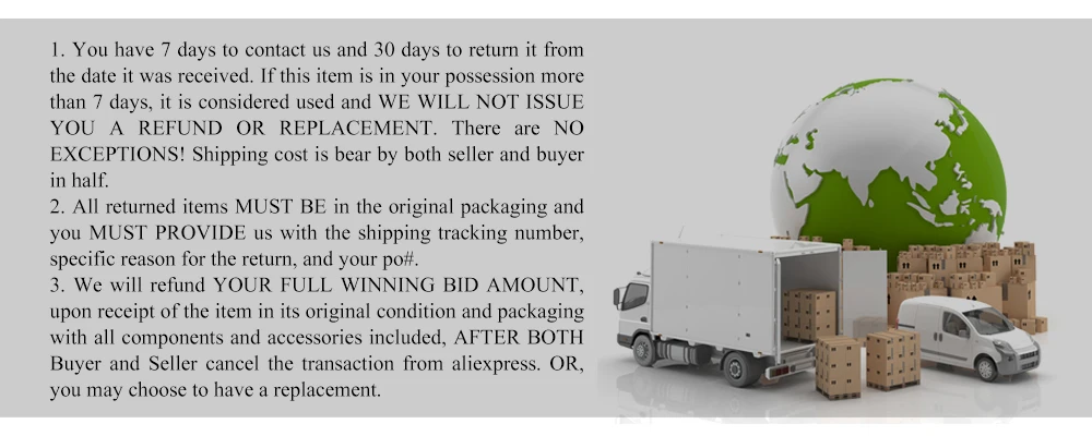 3. Мы вернем вам полную сумму выигрышной заявки при получении товара в его первоначальном состоянии и упаковке со всеми компонентами и аксессуарами, после того как покупатель и продавец отменят сделку с aliexpress. Или вы можете выбрать замену.