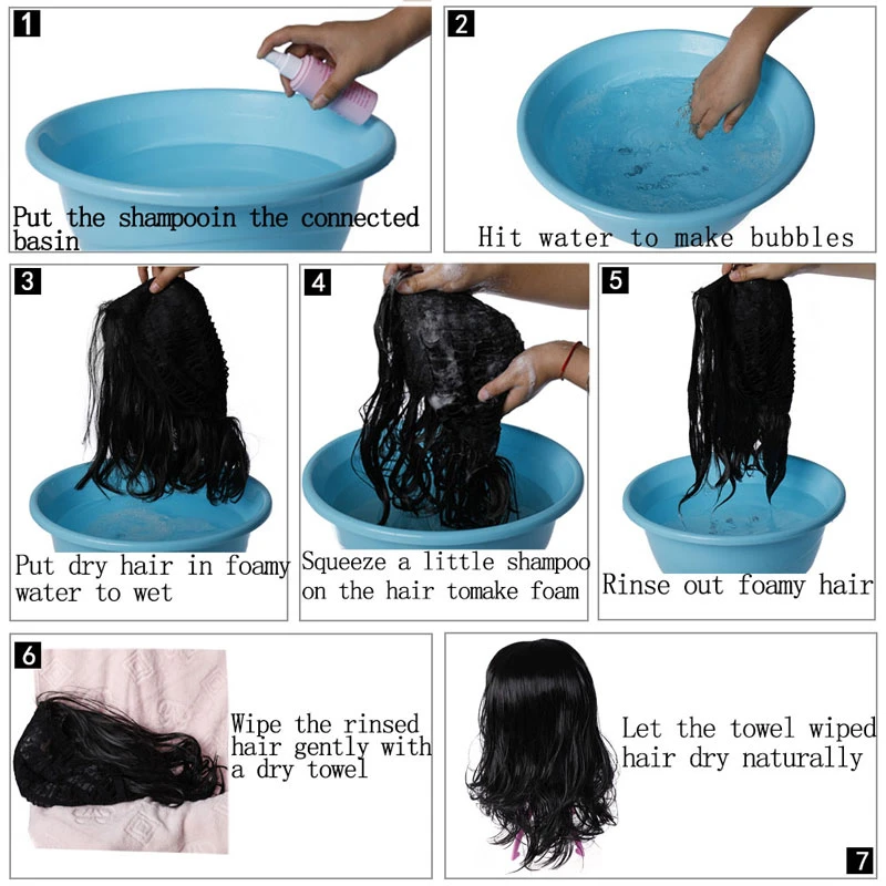 1: Возьмите необходимое количество раствора для ухода и Налейте его в холодную воду, погрузите в парик около 15 минут, аккуратно постирайте, не склейте его энергично, после воздушной сушки, расчешите его в первоначальном стиле парика, после естественного затенения, Прическа будет восстановлена в первоначальном состоянии и станет более глянцевой и эластичной.