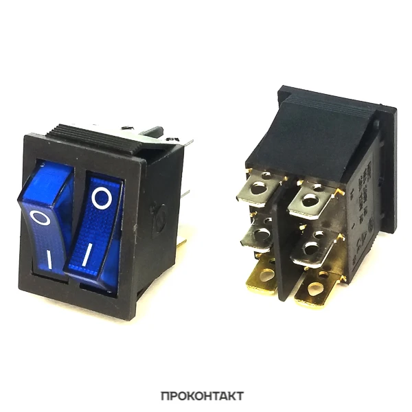 Обратите внимание Стоимость доставки указана за всю посылку, не зависимо от количества данного или любого другого товара из нашего магазина. Переходите по ссылке 'Товары' - вас ждут более 20000 наименований радиодеталей, электронных компонентов, инструмента и расходных материалов для радиолюбителей и профессионалов. Выключатель клавишный 250V 15А (6с) ON-OFF синий с подсветкой ДВОЙНОЙ предназначен для коммутации электрических цепей переменного тока напряжением до 250В. Клавишные (Рокерные) выключатели применяются в качестве комплектующих изделий различного электрооборудования (в сетевых фильтрах и удлинителях, аудио-оборудовании, блоках питания, электроустановках на различных производствах, автомобилях, и многих других местах). Такой клавишный переключатель имеет два положения и две клавиши, что позволит раздельно коммутировать контактные группы. Принцип действия основан на перемещении клавиши в одну из позиций. Для переключения в нужное положение требуется приложить некоторые усилия на клавишу. Монтаж осуществляется без применения винтов на плоских панелях толщиной от 0.8мм до 3мм. Подключение контактов осуществляется плоской клеммой 6.6мм, либо с помощью пайки. Основные характеристики: Номинальное напряжение: 250В; Предельное напряжение: 1500VАС не более 1 минуты; Номинальный ток: 15A (250VAC); Контактное сопротивление: не более 35 мОм; Тип переключения: ON-OFF; Количество контактных групп: 2; Количество контактов в контактной группе: 3; Фиксация положений: да; Индикатор коммутационных положений: синий; Рабочая температура: от -25 до +85; Ресурс: 10 000 циклов.