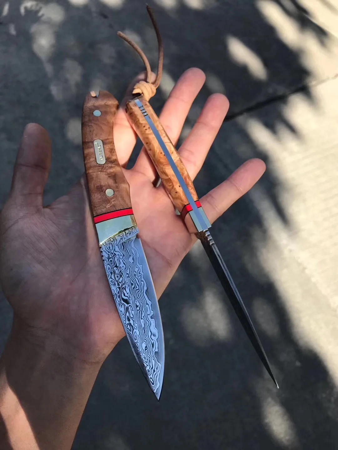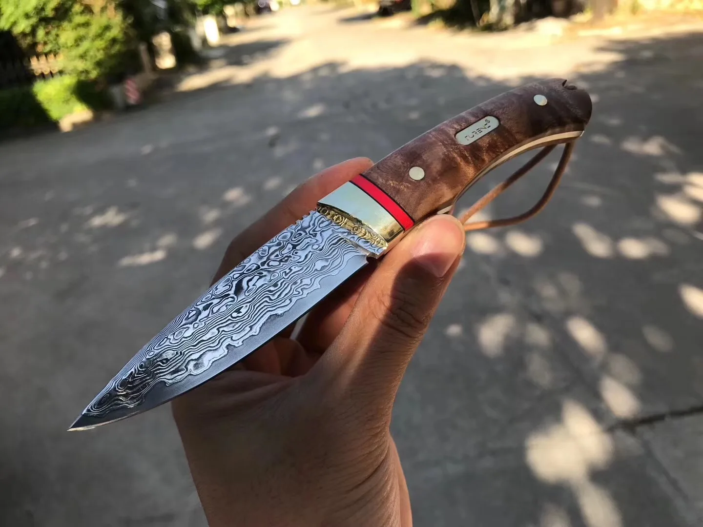 Длина: 18,5 см Длина лезвия: 8,5 см Толщина лезвия: 3 мм Ширина лезвия: 2,8 см Вес: 92 г Твердость: 60-61 HRC Сталь: японская кованая Дамасская сталь VG10, стальной слой сердечника