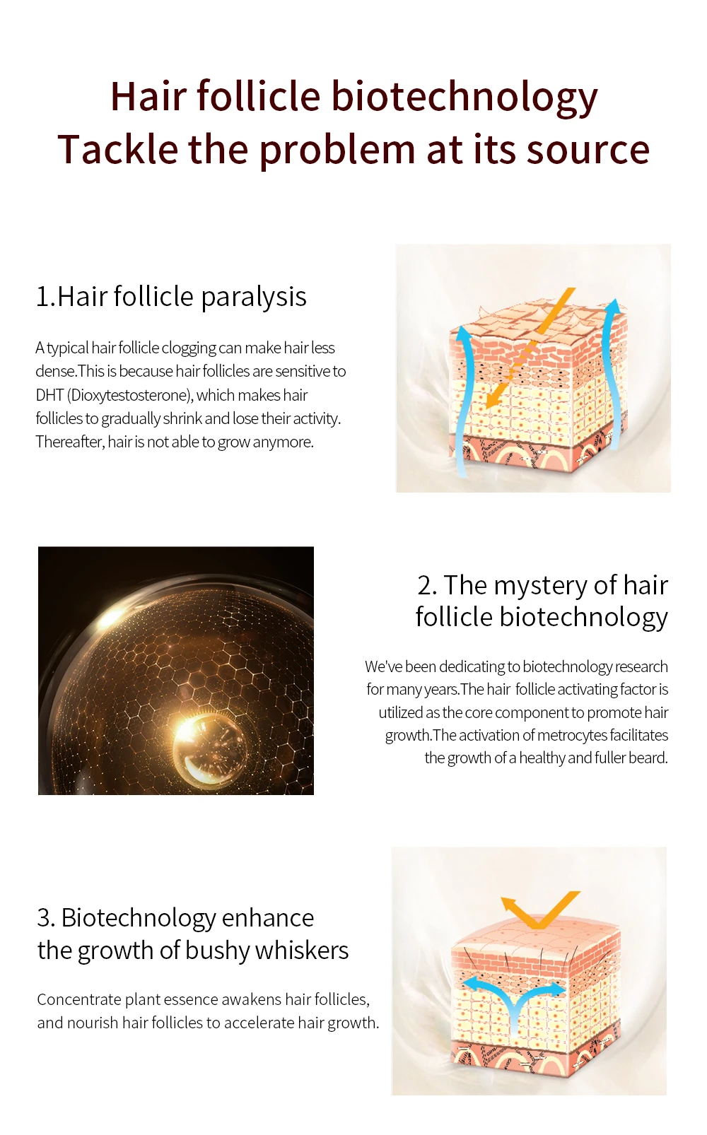 Жидкость для роста бороды может проникать в волосяные фолликулы и высвобождать богатые питательные вещества, чтобы стимулировать активность волосяных фолликул и питать волосяные фолликулы.