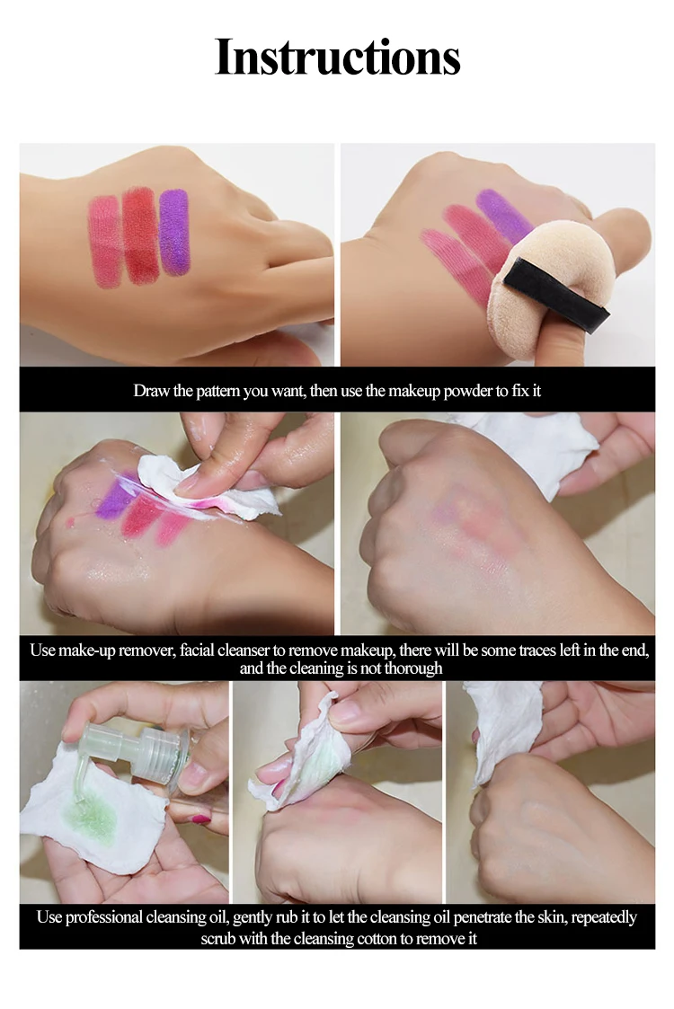 Нежные ингредиенты, безопасные в использовании | Ингредиенты такие же, как помада, используемая девочками | Мягкие и не раздражающие | Хороший водонепроницаемый эффект, не просто перепутать макияж | Яркие цвета и высокая насыщенность | Краску на масляной основе рекомендуется использовать с установочной пудрой | Покраска тела | Стайлинг макияжа | Макияж на Хэллоуин