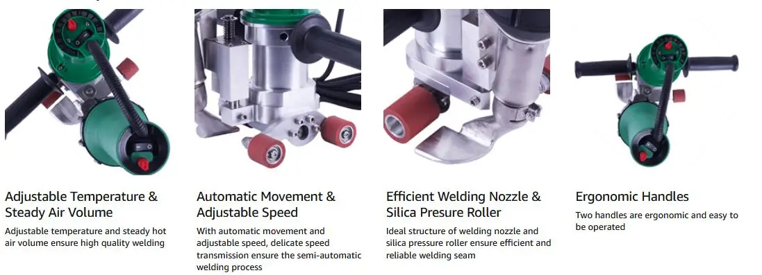 1. Compact stainless steel welding nozzle and silica pressure roller 2. 1600w Steady hot air heating system 3. Delicate automatic walking structure 4. Two ergonomic handles make welding easily 5. Ideal structure of welding nozzle and silica pressure roller ensure efficient and reliable welding seam 6. 20-620 degree adjustable temperature and steady hot air volume guarantee high quality welding 7. With automatic movement and adjustable speed, delicate speed transmission ensure the semi-automatic welding process