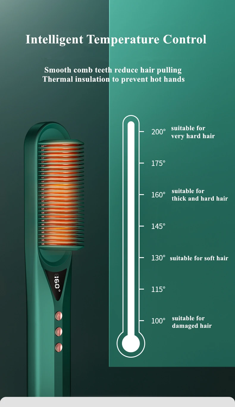 Информация о продукте Название продукта: римская колонна, прямые волосы и кудрявые волосы, массажная расческа Номер товара: ZFS1989 Размер изделия: 280*45*52 мм Номинальное напряжение: 220 В Номинальная частота: 50 Гц Номинальная мощность: 50 Вт Метод нагрева: PTC fever Температура нагрева: 120 °C-200 °C Вес нетто: 400 г [Функция поддержки]: постоянный контроль температуры 100 ~ 200 ℃, 7 уровней свободной регулировки температуры (плюс или минус температура 15 ℃ для каждого уровня), нагрев РСТ, отрицательные ионы не повредят волосы, жидкокристаллический дисплей температуры, 30S Мгновенный нагрев, 36H стереотипы, равномерное нагревание, прямой прокатки двойного назначения, анти-обжигающий дизайн Интеллектуальный контроль температуры Портативный и безопасный Гладкая зубная расческа уменьшает вытягивание волос Теплоизоляция для предотвращения горячих рук 200 °C подходит для очень жестких волос 160 °C подходит для густых и жестких волос 130 °C подходит для мягких волос 100 °C подходит для поврежденных волос