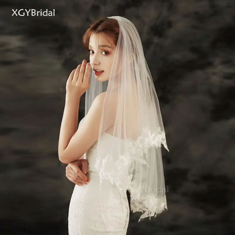 Новое поступление двухслойная Кружевная аппликация дешевые короткие вельветовые Свадебные вуали цвета слоновой кости Мантилья вуаль для церкви