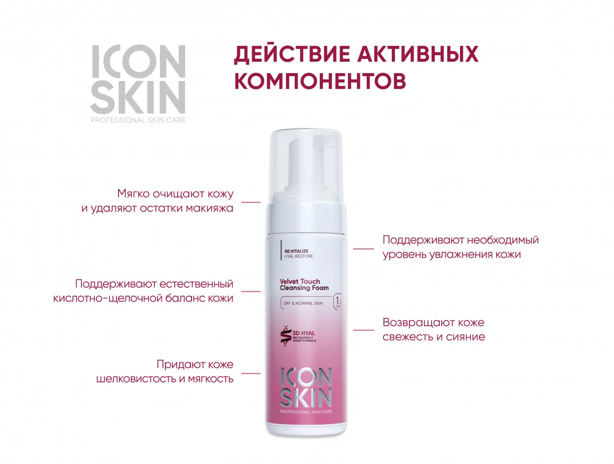 Пенка Velvet Touchпредназначена для бережного очищения нормальной и сухой кожи. Мягко удаляет с лица загрязнения и остатки косметики, сохраняя гидролипидную мантию кожи, ее естественную экосистему и уровень увлажнения. Деликатный состав не травмирует и не пересушивает кожу, не нарушает ее защитные функции, не вызывает ощущения сухости и стянутости. Подготавливает кожу к следующим процедурам и увеличивает их эффективность.ДЕЙСТВИЕ:1) Мягко очищает кожу и удаляет остатки макияжа. 2) Поддерживает естественный кислотно-щелочной баланс кожи. 3) Придает коже шелковистость и мягкость, дарит ощущение комфорта. 4) Поддерживает естественный уровень увлажнения кожи. 5)Возвращает коже свежесть и сияние. РЕЗУЛЬТАТ: шелковистая, мягкая, увлажненная и сияющая кожа. НЕ СОДЕРЖИТ: сульфатов, парабенов, красителей.