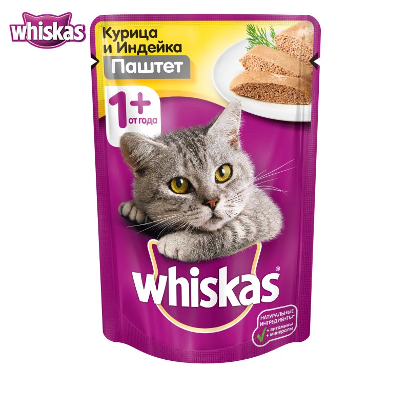 Это сбалансированный рацион, приготовленный именно так, как любит Ваша кошка. Аппетитный паштет из курицы с индейкой в густом ароматном соусе подарит Вашей любимице настоящее удовольствие. Кроме того, Whiskas® содержит все необходимое, чтобы еда Вашей кошки была не только вкусной, но и полезной. Whiskas® для взрослых кошек это: • Оптимальный баланс питательных веществ для полноценной жизни • Все необходимое для поддержания здоровья Вашей любимицы: Омега-6, кальций, фосфор и таурин, витамин Е, цинк.