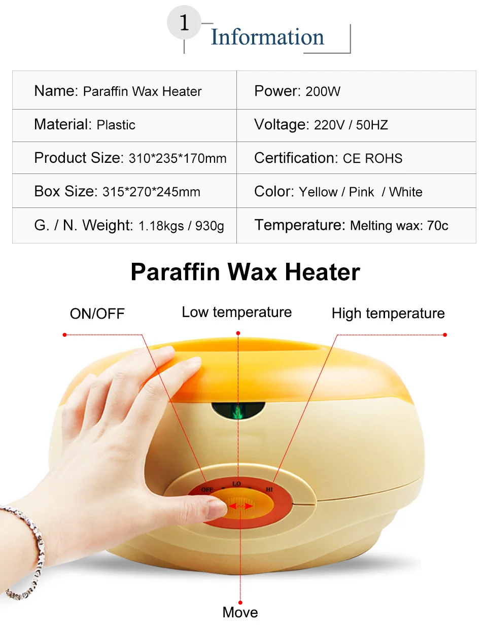 Особенности: Парафиновая маска для лица: парафиновая маска отлично влияет на нормальную и сухую кожу. Он может смягчить эпидермис и тонус морщин, чтобы сделать кожу лица блестящей. Парафиновая обработка рук: парафин может сделать кожу на руке мягкой. Лечение парафиновых Стоп: использование парафиновой маски после педикюра, позволяет парафину обрабатывать ноги и способствует хорошей циркуляции крови. Описание: Обеспечивает Термическое облегчение боли. Парафиновый воск разглаживает и смягчает кожу.