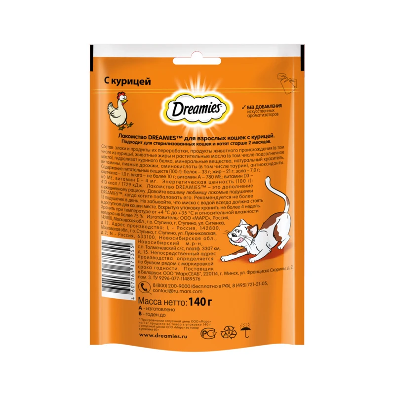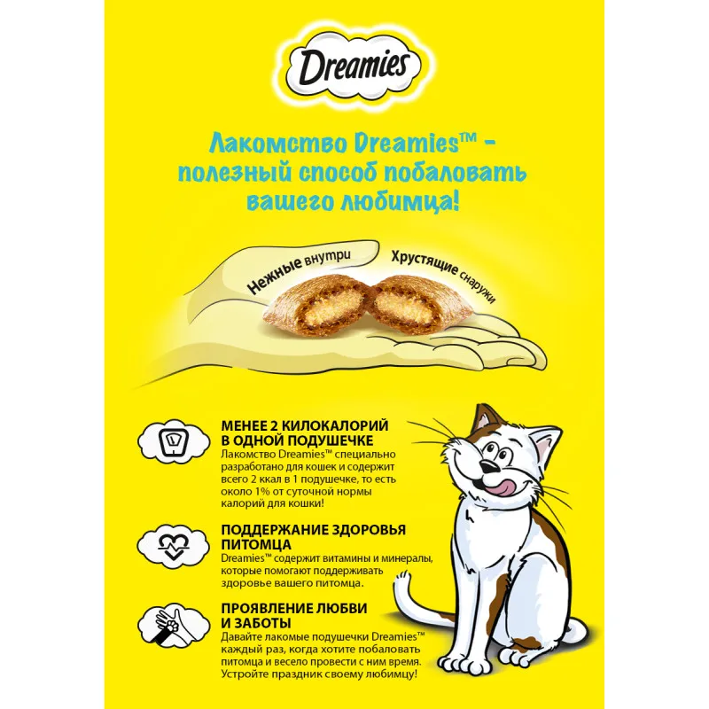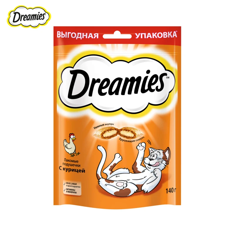 Незабываемая нежная курочка в хрустящей вкусной подушечке – это достойная награда вашему любимому зверю. Теперь ему не нужно охотиться, стоит только открыть упаковку, и курочка никуда не убежит! В состав Dreamies Лакомые Подушечки входят важные для кошки питательные вещества, витамины и минералы, а значит, такое угощение приносит не только радость, но и пользу.