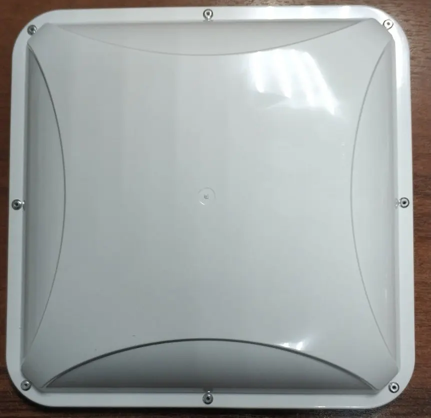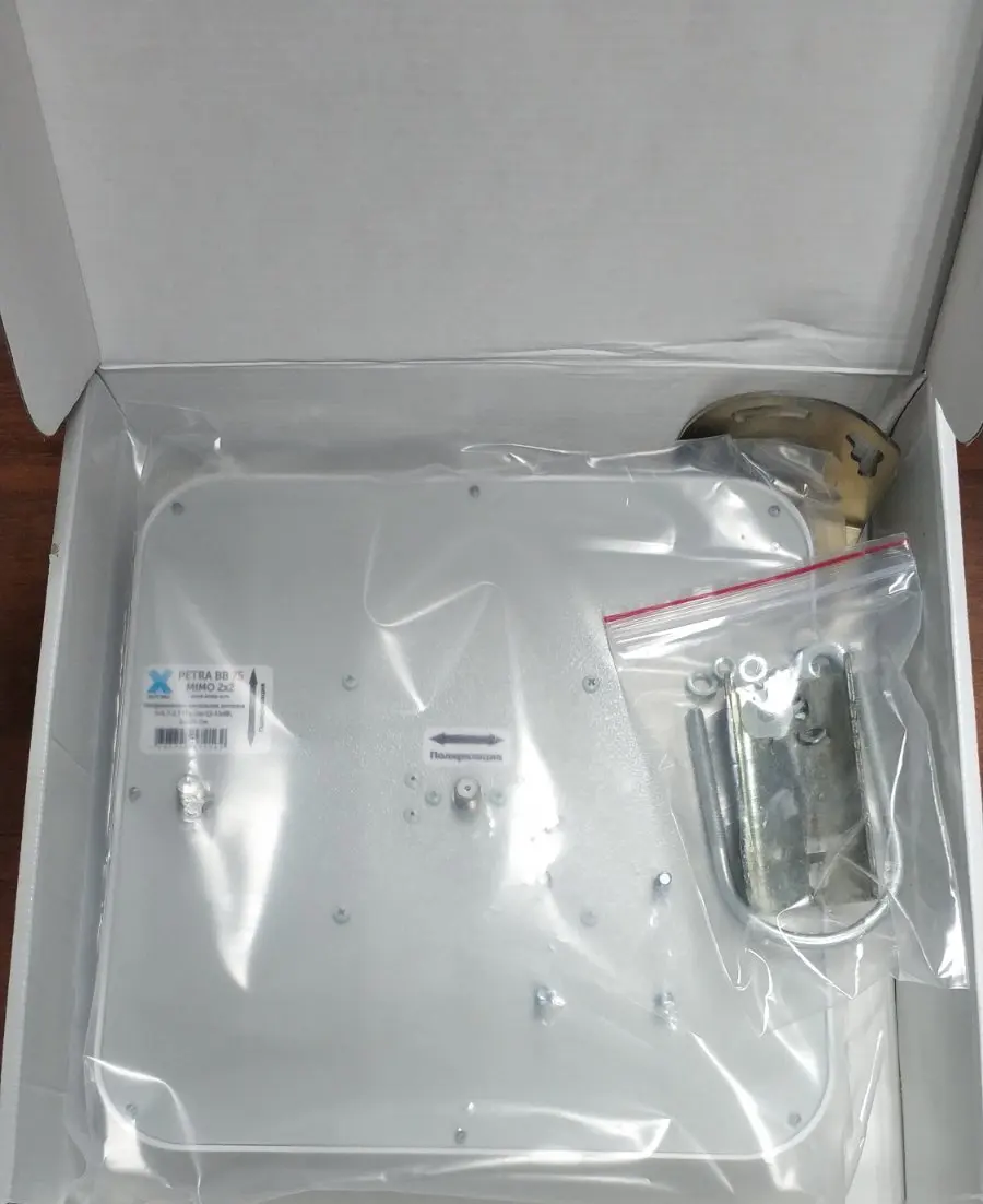 Тип антенны – синфазная полосковая решетка. Активные излучателя антенны надежно укрыты от осадков в пластиковый корпус. Входы антенны короткозамкнуты по постоянному току между внешним и внутренним проводниками, что снижает вероятность накопления статического электричества на входе модема и делает необязательным применение грозоразрядника (при небольшой длине соединительного фидера между модемом и антенной). Крепление позволяет изменять угол наклона антенны и угол наклона поляризации.