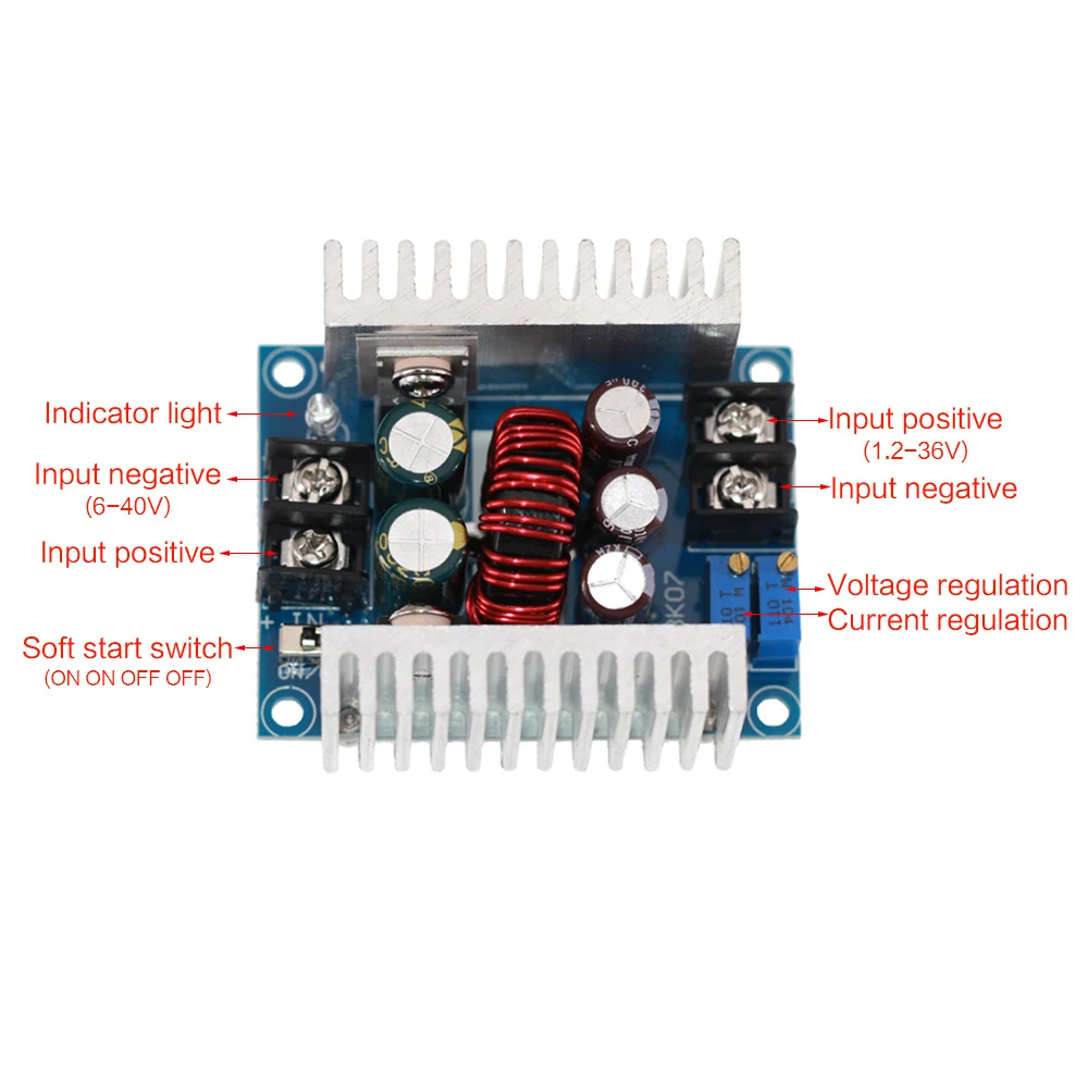 Применение: Этот понижающий модуль напряжения с широким диапазоном входного напряжения от 6 В до 40 в, понижающий преобразователь может точно регулировать выходное напряжение и ток.