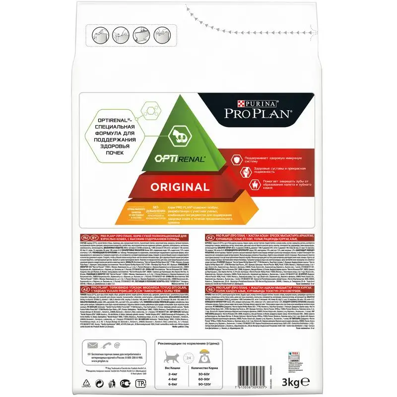 Each diet of the Pro Plan original line contains carefully selected nutrients that maintain the health of the cat at every stage of its life. Pro Plan original for adult cats from 1 year old has a high level of antioxidants and vitamins, in particular vitamins C and E, which ensures a healthy immune system. Contains the optirenal formula-a special combination of nutrients, including antioxidants, arginine and omega-3 fatty acids that support kidney health.