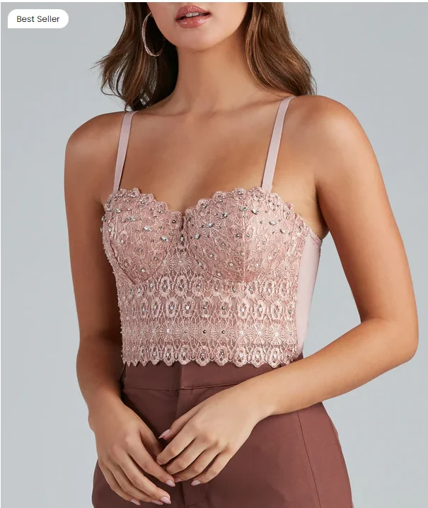 Царство с гламуром в укороченном топе, который приносит блеск и роскошь в вашей ночной наряд. Этот ослепительный укороченный топ с очаровательным вырезом в виде сердца, лифом, напоминающим бюстье, и мягкими чашечками, которые обеспечивают дополнительную поддержку пуш-ап для изгиба. Полупрозрачный Лиф украшен бусинами и сверкающими блестками. Завершите свой образ брюками с высокой талией и модными блочными каблуками, которые спадают.