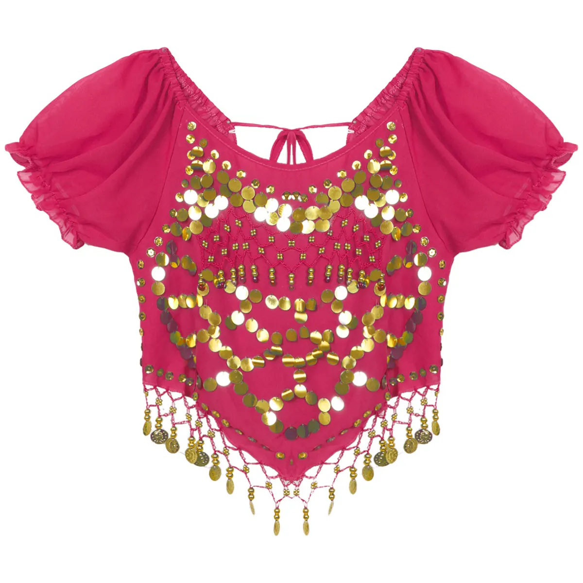 С бусинами и блестящими круглыми кисточками спереди, привлекая больше внимания к вам, когда Вы пачкаете на танцполе.