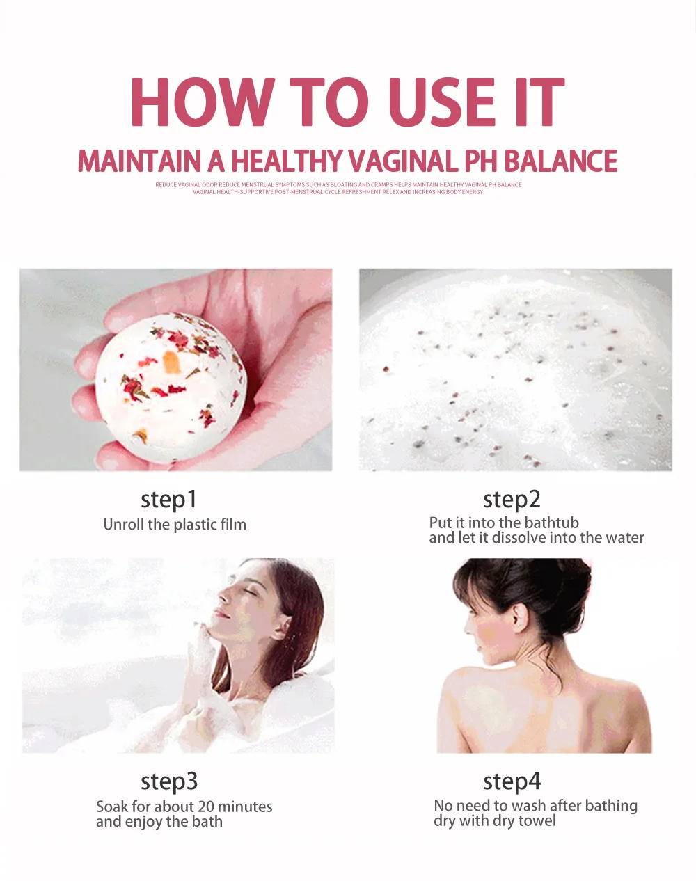 Поместите в ванну бомбу yoni, дайте ей раствориться в течение 5-10 минут, затем Замочите около 20-30 минут для достижения наилучших результатов. 2-3 раза в неделю