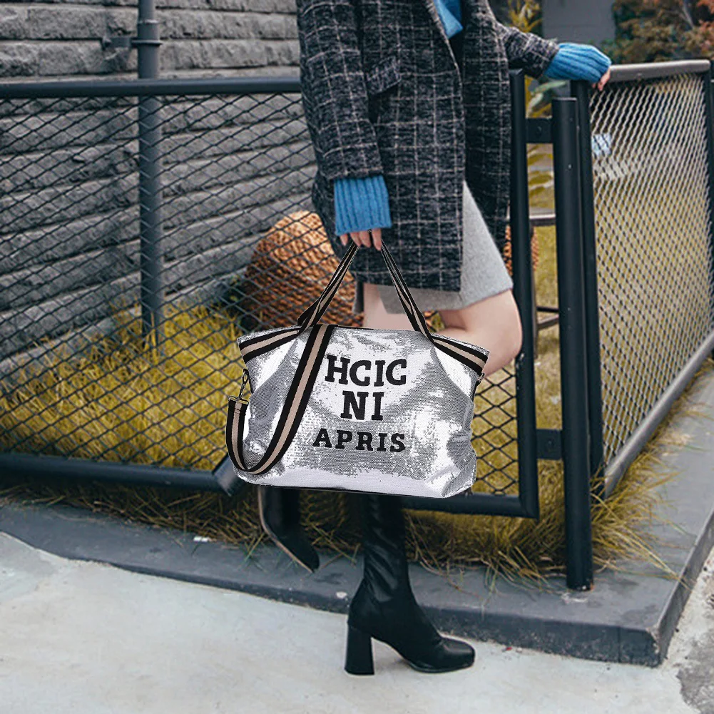 Женская Большая вместительная сумка-тоут с буквами и блестками, Повседневная дизайнерская большая сумка через плечо, Женская дорожная сумка для покупок Особенности: Изысканный дизайн с буквами и большой емкостью. Материал с блестками, Повседневный, красивый и прочный. Регулируемый плечевой ремень. Спецификация: Основной материал: блестки Размер: 450*350*100 мм/17,71*13,77 * 3.93in Использование: сумка через плечо, сумка-мессенджер, Портативная сумка Плечевой ремень: Один плечевой ремень Цвет: черный, розовый, серебристый, зеленый Пол: женщин Повод: досуг, ежедневно Примечания: 1. Из-за различий в мониторах и световых эффектах фактический цвет изделия может немного отличаться от цвета, показанного на фотографиях. Спасибо! 2. Возможны отклонения в 1-3 см из-за измерений вручную.