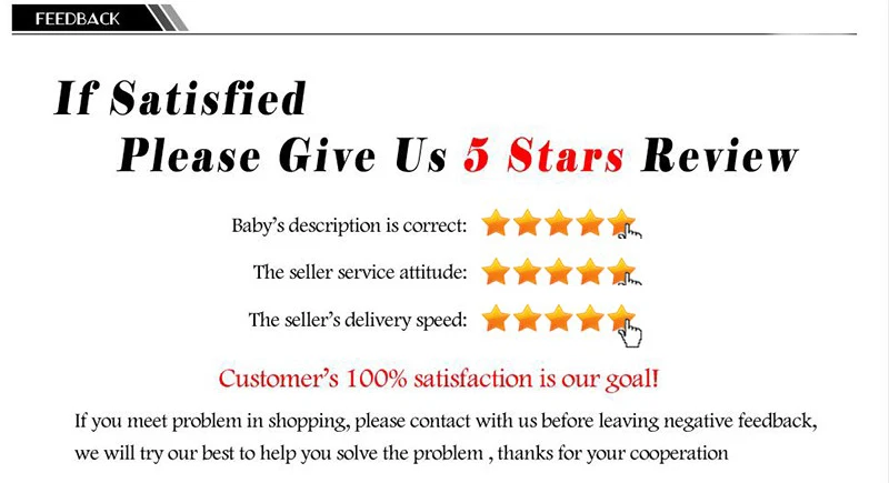 -Пожалуйста, оставьте отзывы 5 звезд, если вы удовлетворены нашими товарами и услугами, ваши положительные отзывы очень полезны для других покупателей и нас.