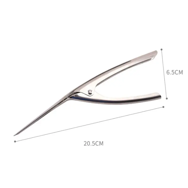 4. Способ использования: вставьте закрытый наконечник креветки в верхнюю часть оболочки. Аккуратно нажмите на наконечник (все еще закрыт) под оболочкой, пока он не выходит за хвост. Удерживайте ручки вместе, пока креветки и оболочка не будут отделены. Краску креветки под холодной водой.