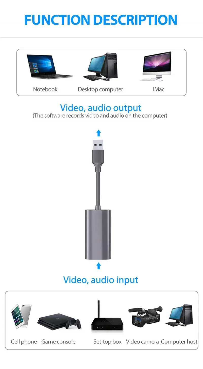 1. Захват игры HDMI: на основе высокоскоростной технологии USB 2,0, вы можете запечатлеть видеосигнал HDMI высокой четкости сигнального канала. Карта захвата игры подходит для устройств с выходом HDMI, таких как устройства для PS4, для Xbox one, для Wii U и для переключения.