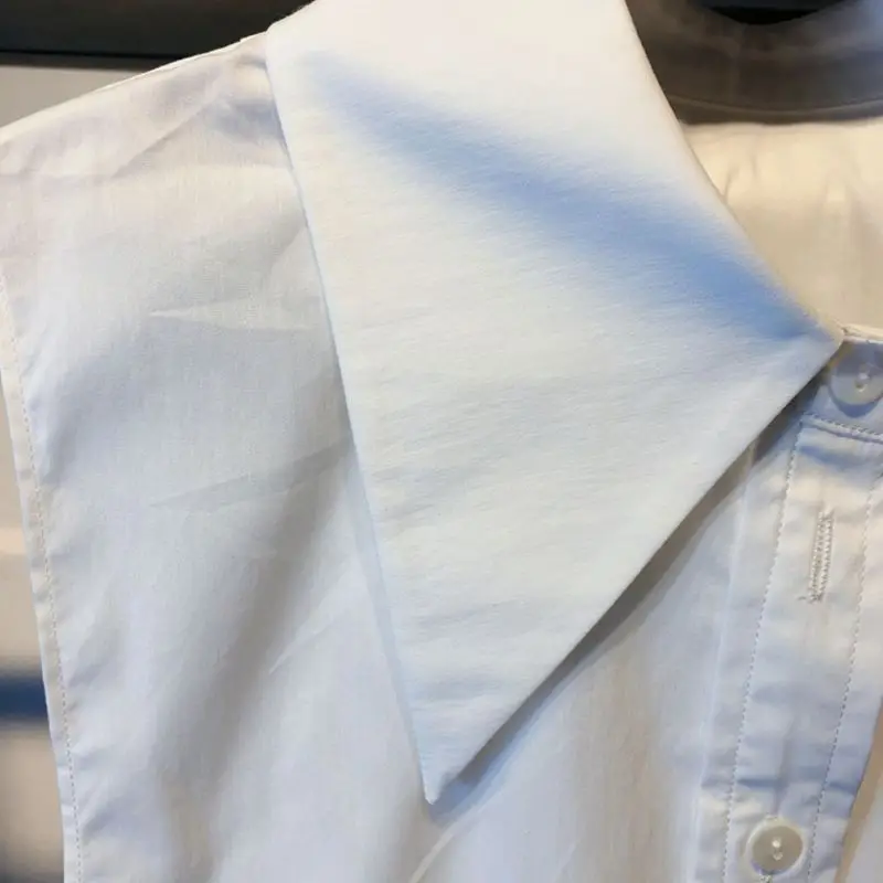 Отложной заостренный треугольный воротник, застежка на пуговицах, классический однотонный белый цвет.