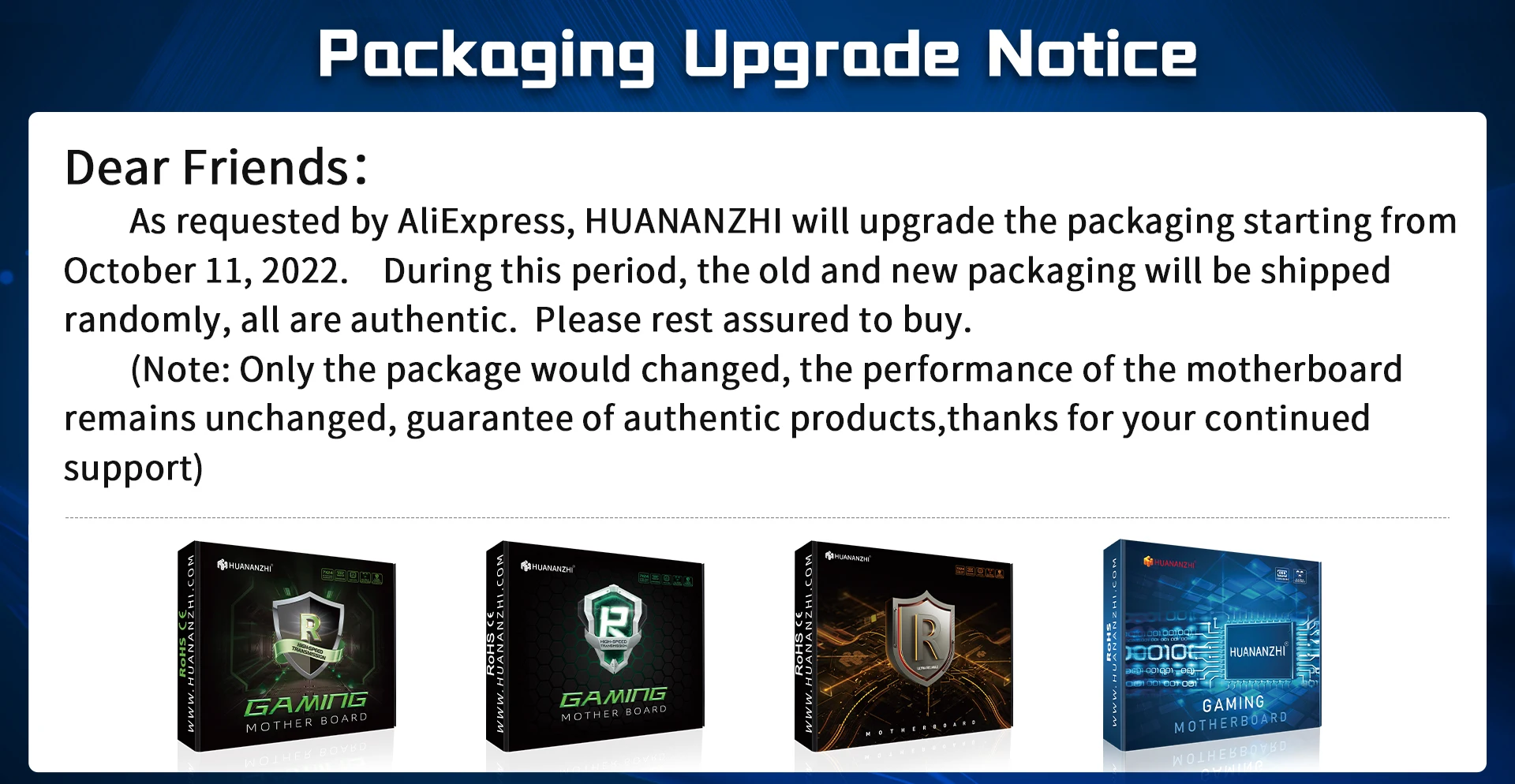 По просьбе AliExpress, HUANANZHI обновит упаковку с 11 октября 2022 года. В течение этого периода, старая и новая упаковка будет отправлена случайным образом, все Аутентичные. Пожалуйста, будьте уверены в покупке.