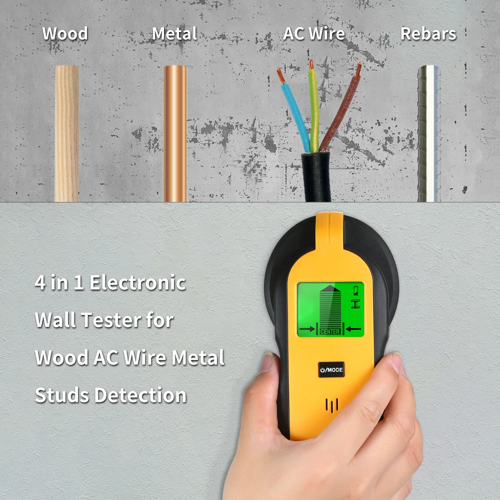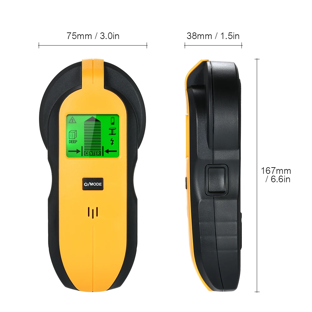Мультисканер шпилек для дерева, металла, глубокого, переменного тока провода. Быстро определяет местонахождение кромок и середины дерева, шпилек стен, металлических труб, деревянной балки, арматуры за стенами, полами и потолками, также указывает на наличие провода переменного тока под напряжением.