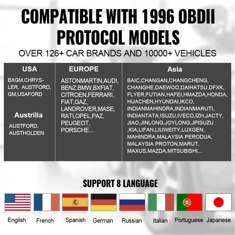 Поддержка покрытия до более 126 крупных производителей автомобилей из Америки, Европы и Азии: 9 языков