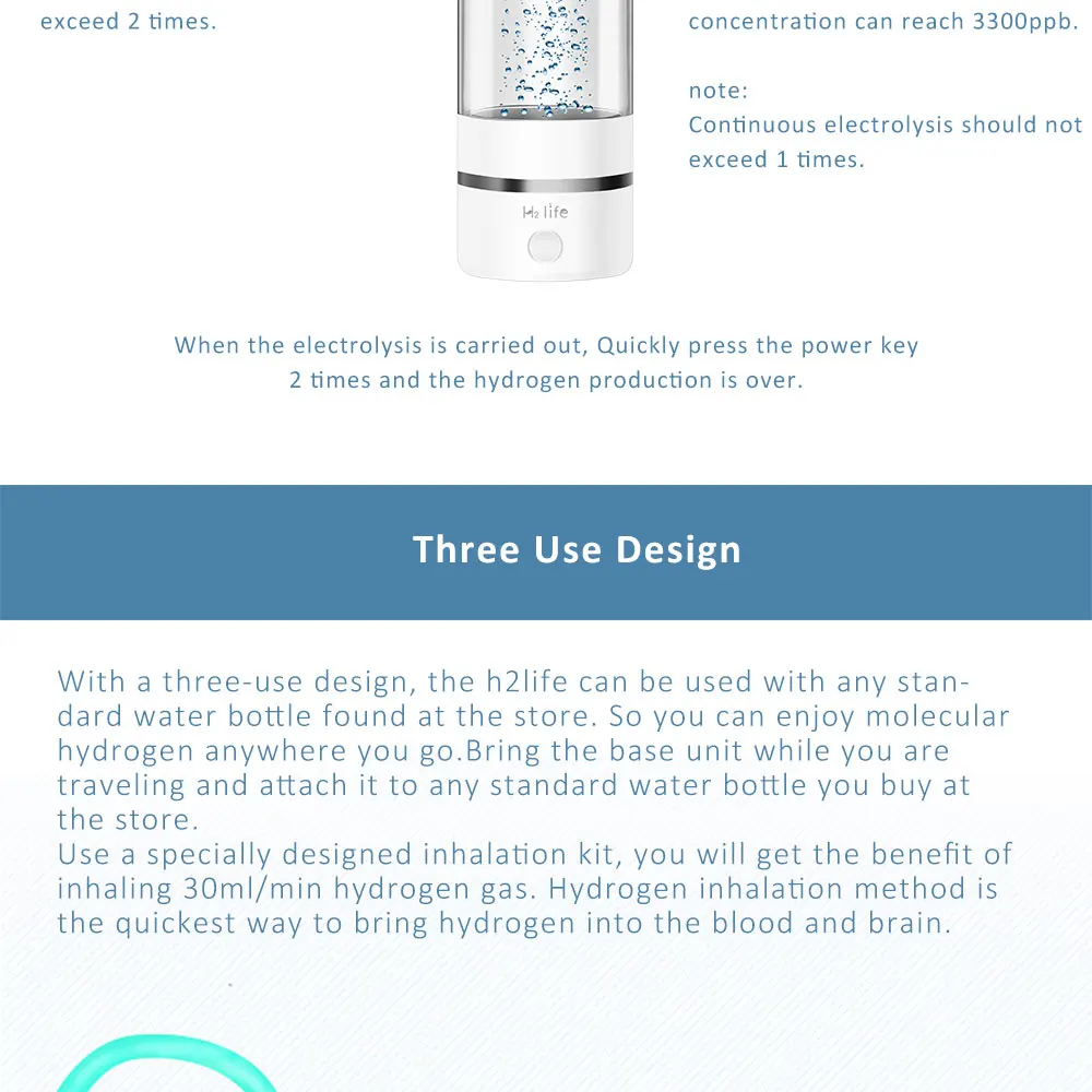 -Двойная конструкция использования: с двойной конструкцией, H2Life водородная бутылка для воды может быть использована с любой стандартной бутылкой для воды, которую можно найти в магазине. Так что вы можете наслаждаться молекулярным водородом в любом месте. Возьмите базовый блок во время путешествия и прикрепите его к любой стандартной бутылке для воды, которую вы покупаете в магазине. (Подходит только для универсального узкого места для минеральной воды внутреннего диаметра 26 мм.)
