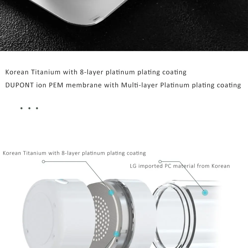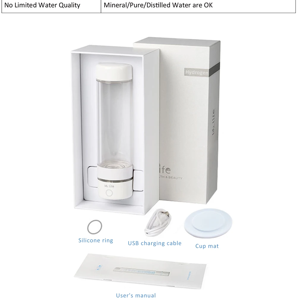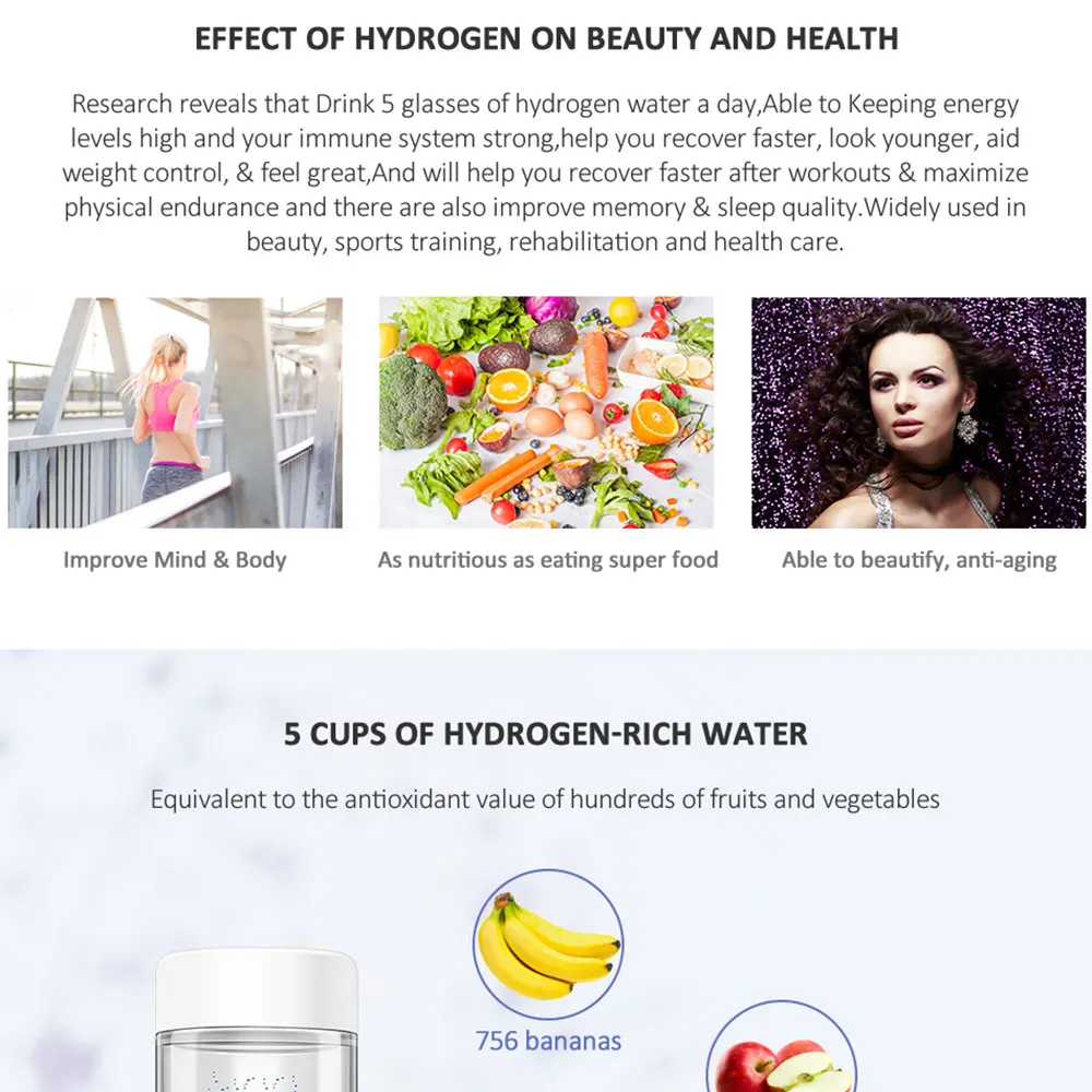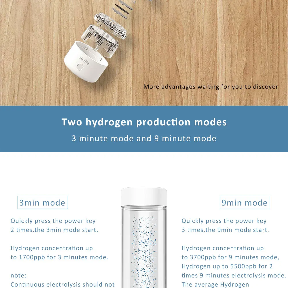 Водородная вода легко впитывается в ваше тело, чтобы повысить метаболизм и увеличить микроциркуляцию тела. Бутылка генератора воды водорода делает воду в высокой концентрации водорода от 1700ppb-5500ppb, ОВП от-300мв до-700мв. Самое главное, благодаря высокому качеству мембраны DUPONT ion PEM с многослойным платиновым покрытием, она помещает только чистый H2 в воду. Кислород, озон и хлор отделены. Таким образом, Водородная вода, которую вы получаете, 99.99% чистый H2, без хлора, без кислорода, без H2O2, без озона. Может прикрепить одноразовые пластиковые бутылки для питьевой воды, портативные для путешествий, работы и офиса. Можно использовать любой вид воды: минеральная вода, чистая вода и дистиллированная вода приветствуются. Она может электролировать 0 ℃ ~ 60 ℃, даже может непосредственно сделать воду с высоким содержанием водорода.