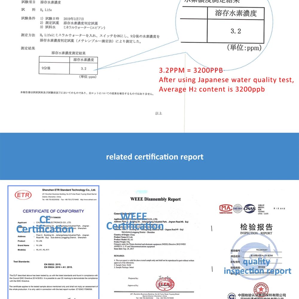 8. Эксклюзивная Водорастворимая водородная технология, после производства водорода в течение 2 часов, водород высокой концентрации все еще может быть сохранен в бутылке с водородом; Закройте крышку через 17 часов, все еще остается около высокого водорода 1000ppb.