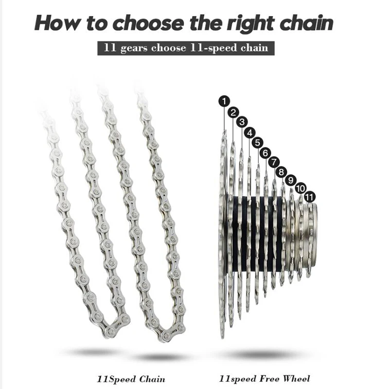 Примечание:Как выбрать правильную цепь: Соблюдайте количество частей маховика. Если маховик имеет 11 штук, пожалуйста, выберите 11-скоростную цепь