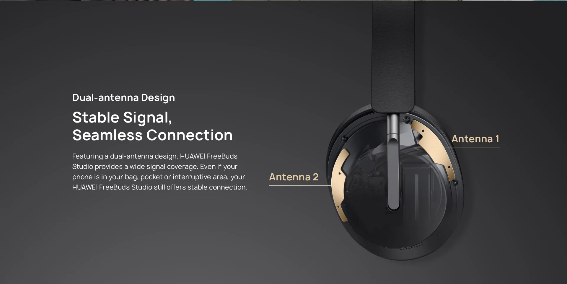Благодаря двухантенному дизайну HUAWEI FreeBuds Studio обеспечивает широкое покрытие сигнала. Даже если ваш телефон находится в сумке, кармане или области прерывания, ваш HUAWEI FreeBuds Studio по-прежнему обеспечивает стабильное соединение.