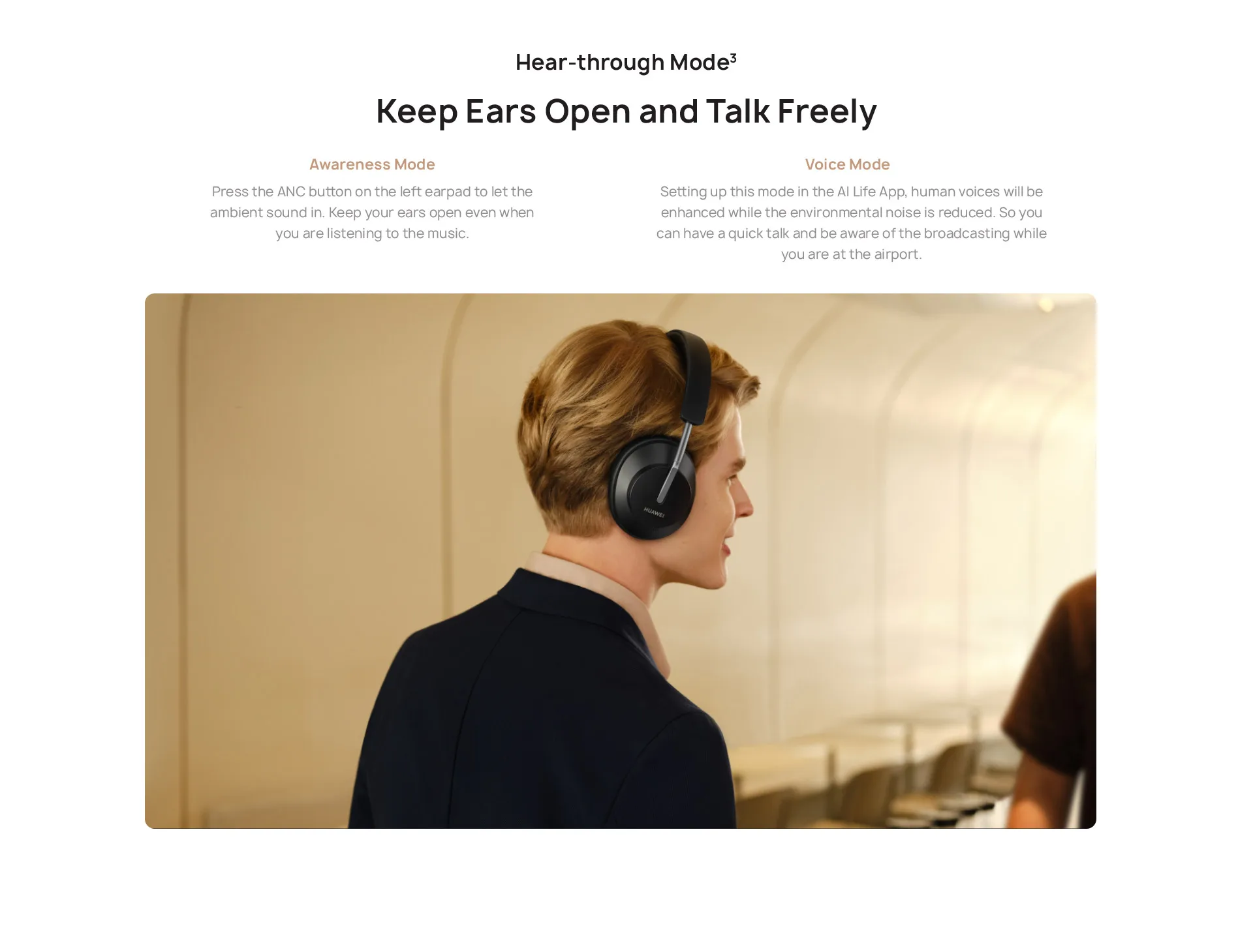 Настройка этого режима в приложении AI Life, человеческий голос будет усилен, в то время как Экологический шум снижается. Так что вы можете быстро говорить и быть в курсе вещания, пока вы находитесь в аэропорту.