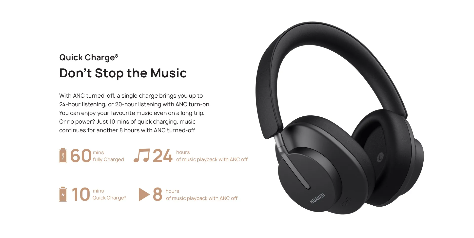 С выключением ANC, Одна зарядка позволяет вам слушать до 24 часов или 20 часов прослушивания с включением ANC. Вы можете наслаждаться любимой музыкой даже в долгой поездке. Или нет питания? Всего 10 минут быстрой зарядки, музыка продолжается еще 8 часов с выключением ANC.