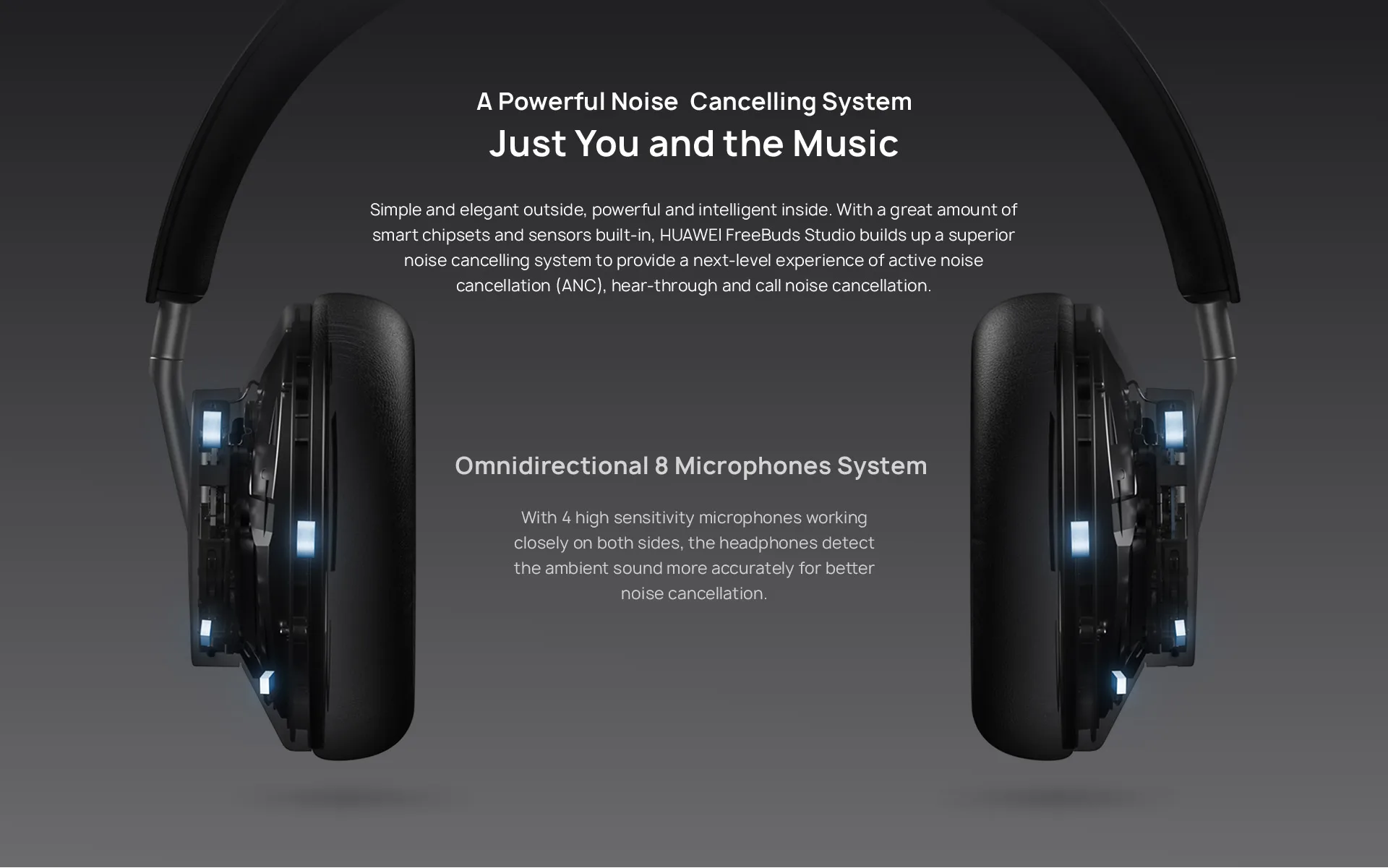 Простой и элегантный снаружи, мощный и умный внутри. Благодаря большому количеству встроенных интеллектуальных чипсетов и датчиков HUAWEI FreeBuds Studio создает превосходную систему шумоподавления, чтобы обеспечить новый уровень активного шумоподавления (ANC), подавление шума при прослушивании и вызове.
