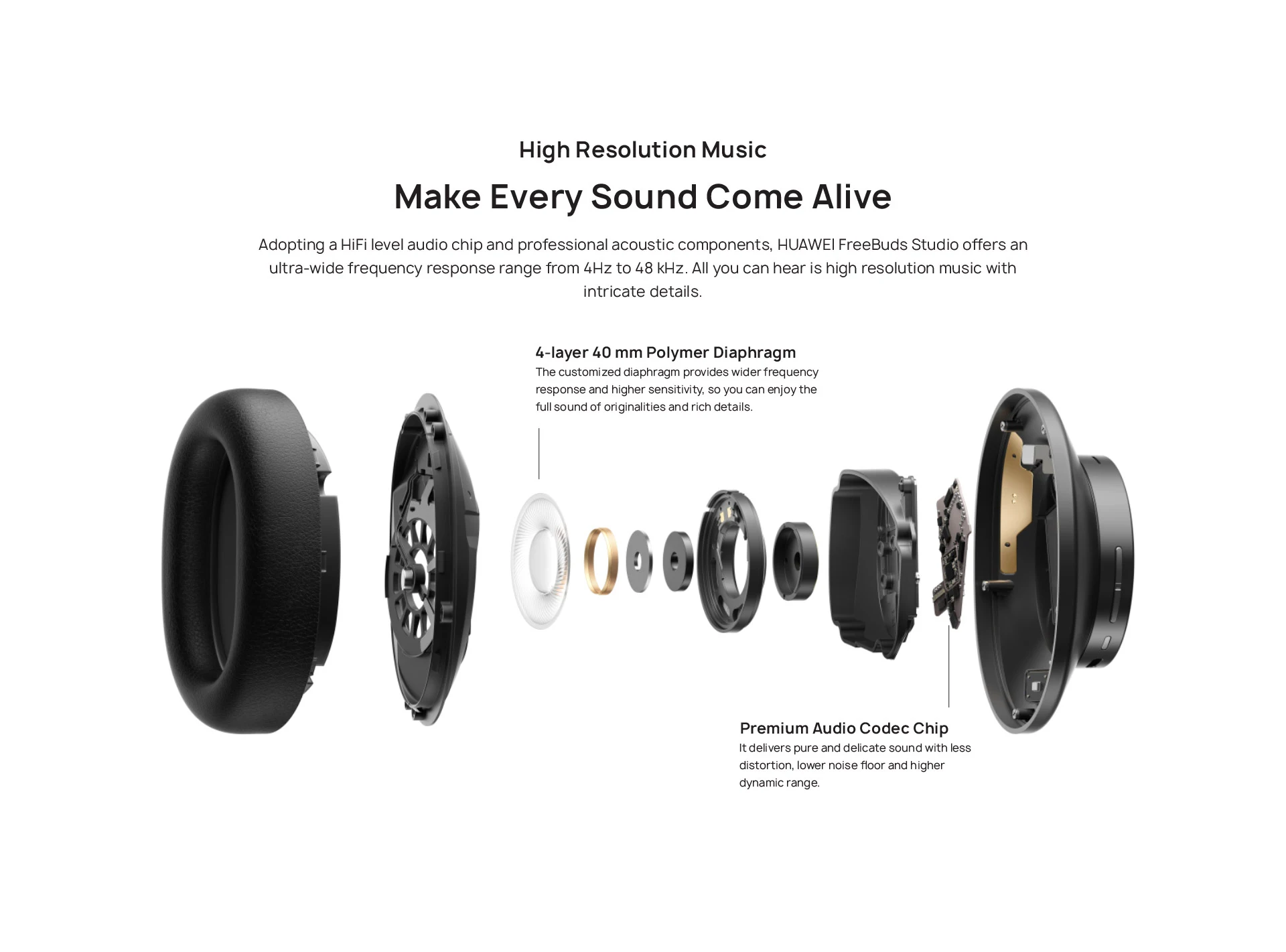 Каждый звук оживаетС помощью аудиочипа Hi-Fi уровня и профессиональных акустических компонентов HUAWEI FreeBuds Studio предлагает ультра-широкий диапазон частот от 4 Гц до 48 кГц. 2 Все, что вы можете услышать, это музыка с высоким разрешением и сложными деталями.