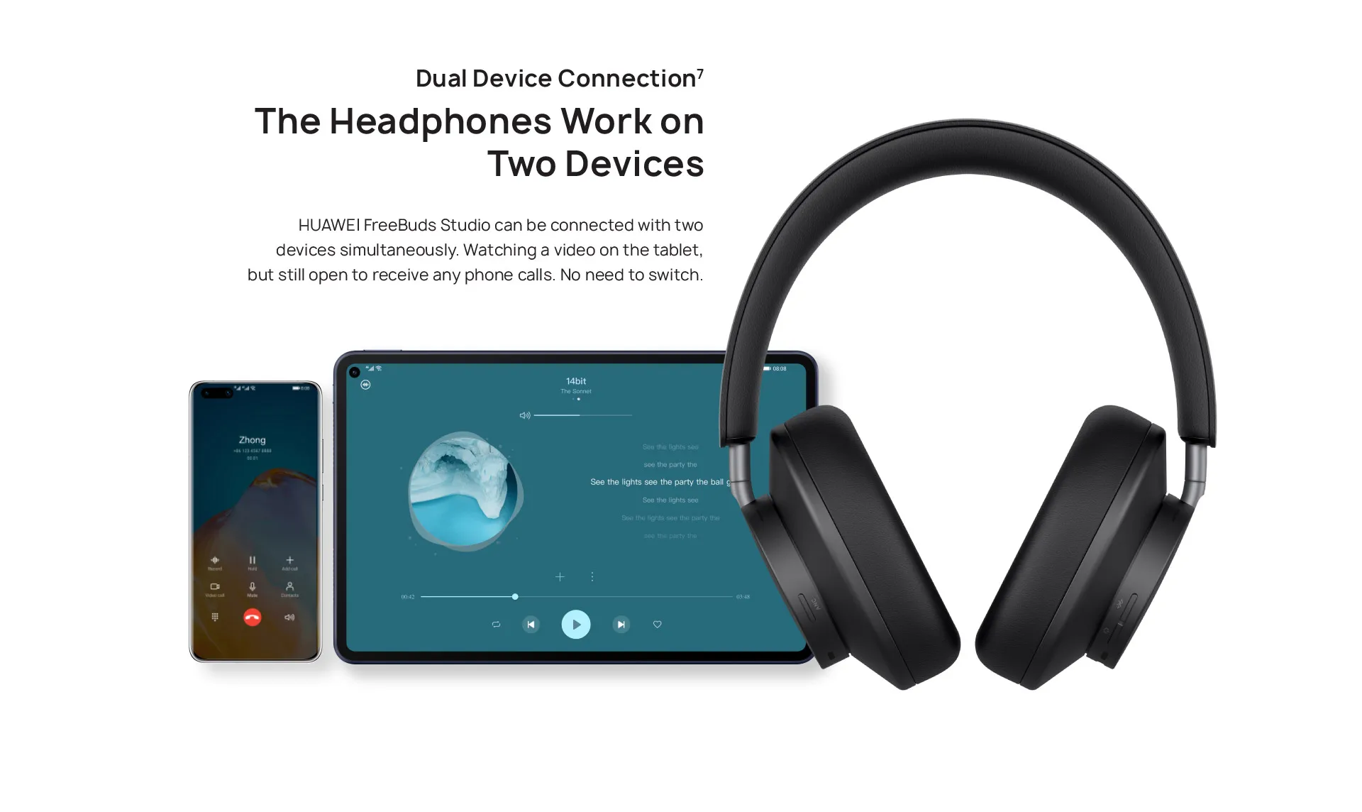 Студия HUAWEI FreeBuds может быть соединена с двумя устройствами одновременно. Смотрите видео на планшете, но все еще открывайте, чтобы принимать любые телефонные звонки, просто дважды кликнув на правый наушник. Переключатель подключения не нужен.