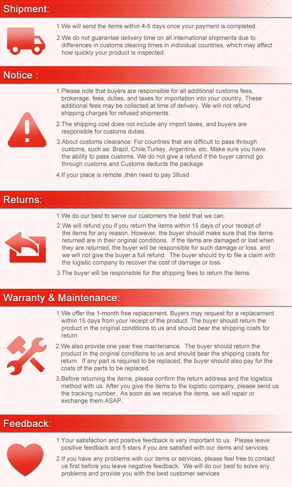 1. Мы не несем ответственности за какие-либо таможенные пошлины или налог на импорт, это ответственность покупателя.