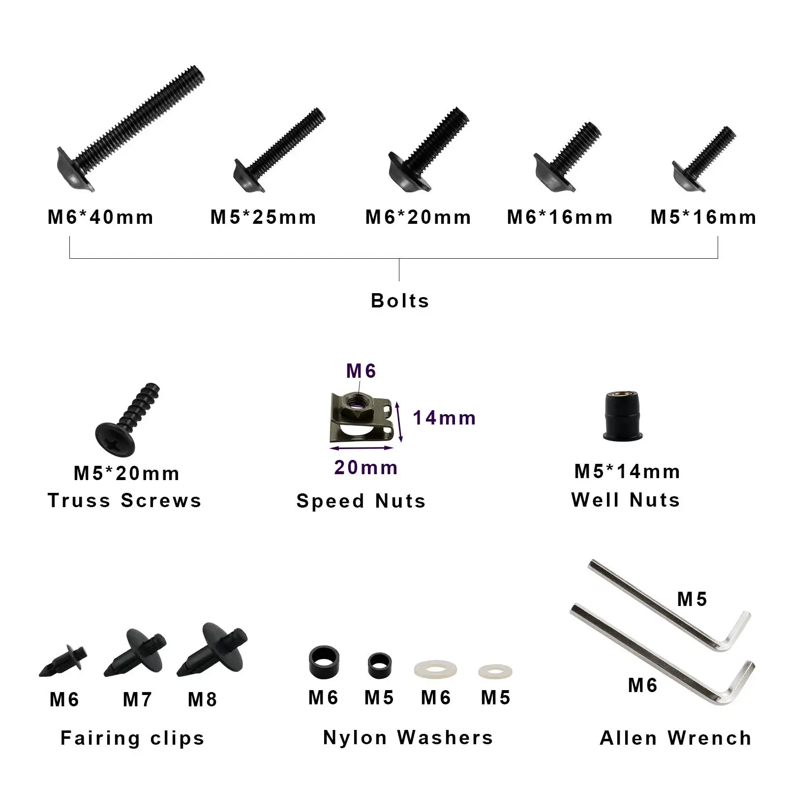 Описание Приспособление: Подходит для большинства мотоциклов. Обратите внимание: Покупатель несет ответственность за проверку подходящего размера перед заказом. Это может не соответствовать вашим потребностям на каждой застежке на Вашей поездке, но он может заменить много застежек на многих различных моделях. Особенности Используется для установки OEM и aftermarket обтекателей. Тип головки кнопки для быстрой и легкой установки и очистки. Головка Torx (Шестигранная) Вставка для гладкой установки и предотвращения проскальзывания/зачистки. Низкопрофильные шайбы, которые плавятся в любой дизайн краски. Если есть какие-либо потребности, пожалуйста, свяжитесь с нашим персоналом по обслуживанию клиентов, мы ответим вам как можно скорее. Это запасной шпиль и Комплект болтов, и превосходная технология. И подходит для большинства моделей. (Не подходит на 100%) Подробные Размеры приведены в следующем описании. Перед покупкой проверьте, подходят ли размеры. Не ржавеет, устойчивость к окислению, кислота, щелочь, коррозии, стойкости. Установите все Обтекатели как показано ниже, но не ограничиваясь Верхний обтекатель Боковой обтекатель Нижний обтекатель Задний обтекатель Отделка и внутренние панели Переднее крыло Заднее крыло Ветровые стекла Информация о продукте -Состояние на 100% абсолютно новый -Материал: высококачественный алюминий (не прочный, как нержавеющая сталь) -Цвет: такой же, как на изображении. Красный, зеленый, синий, черный, золотой, серебряный -Отделка поверхности: анодированный защитный слой поверхности, устойчив к коррозии и выцветанию. -Классный и привлекательный цвет для украшения. -Простота установки без инструкции. Количество 1 комплект, в который входит Болты M6- (6x40 мм) x 6 шт. Болты M6- (6x16 мм) x 20 шт. Болты M6- (6x20 мм) x 20 шт. Болты M5- (5x16 мм) x 20 шт. Болты M5- (5x25 мм) x 8 шт. Крепежные винты x4 Нейлоновые шайбы для 6 мм x20 Нейлоновые шайбы для 5 мм x20 Обтекатели: M6x5, M7x5, M8x5 Шестигранный ключ: M5x1 M6x1 Пружинные гайки: 14 шт.