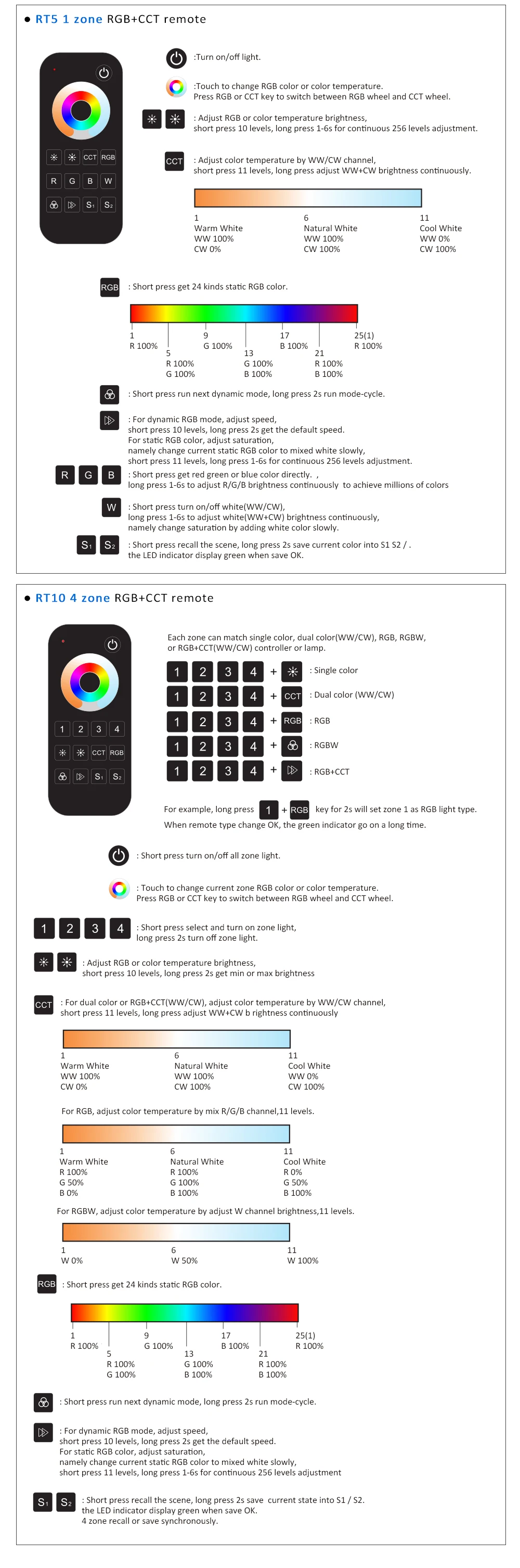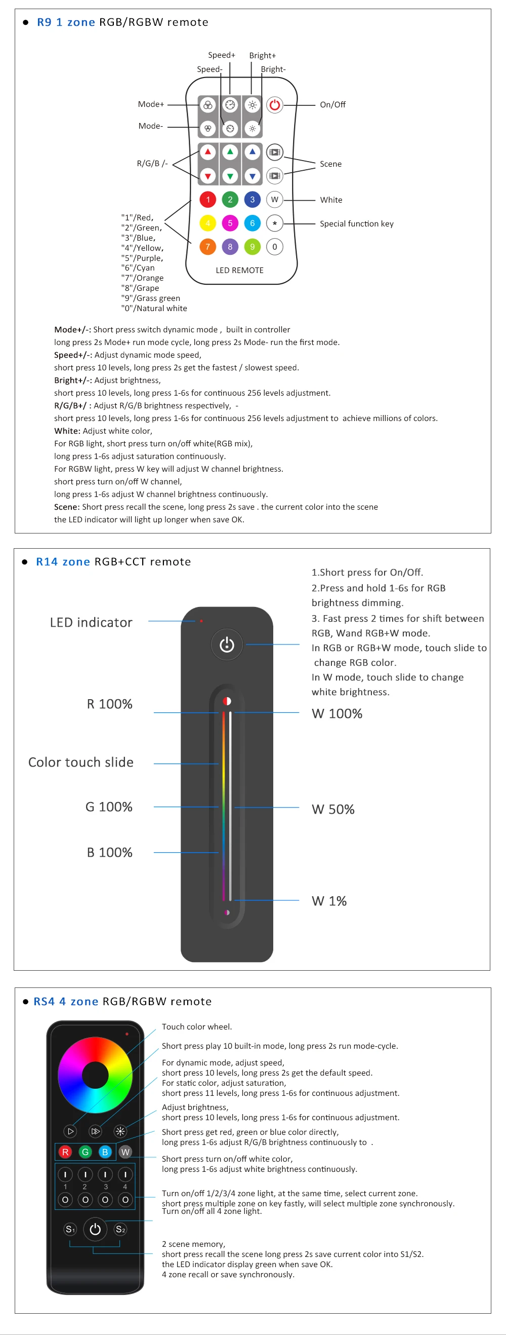 ● Функция 5 в 1, используется для управления RGB, RGBW, RGB + CCT, цветовая температура или одноцветная светодиодный лента.