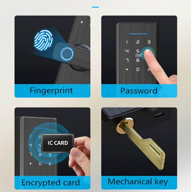 Открытый тип | Приложение Tuya + отпечаток пальца + пароль + ключ + карта | Толщина двери | 38-55 мм |
