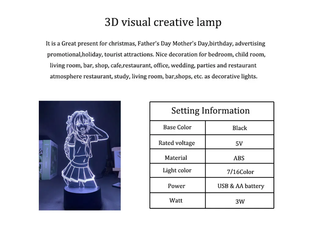✔. Если у вас есть индивидуальные требования, пожалуйста, откройте чат и отправьте нам фотографии, которые вы хотите сделать 3D ночной светильник.