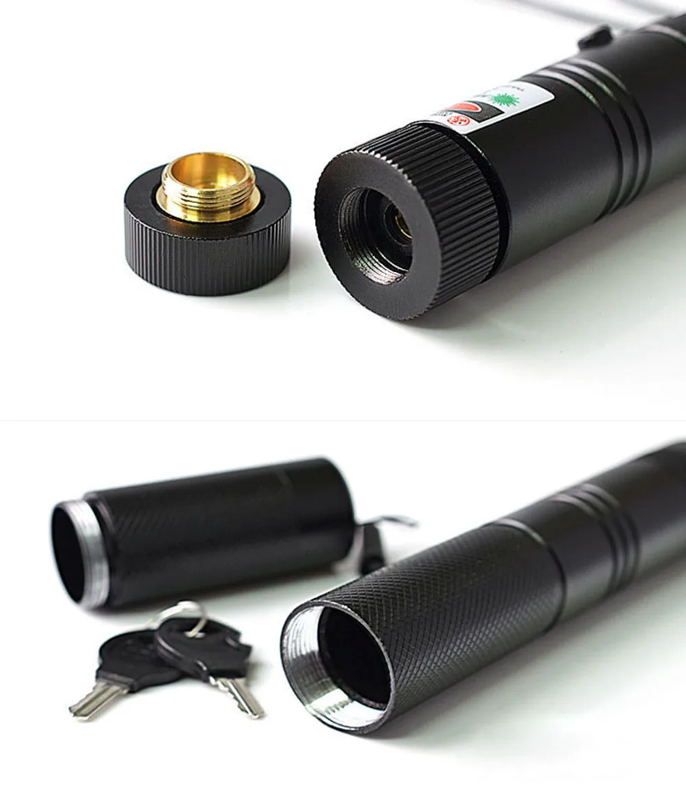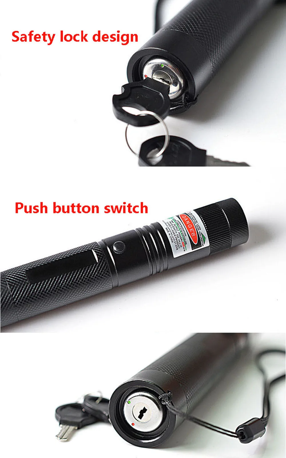 2. С замком безопасности ребенка, вы можете повернуть ключ переключателя к красной точке и вытянуть его, чтобы отключить питание, когда не используется; 3. Внешний фокус, легко регулировать толщину луча и размер пятна;