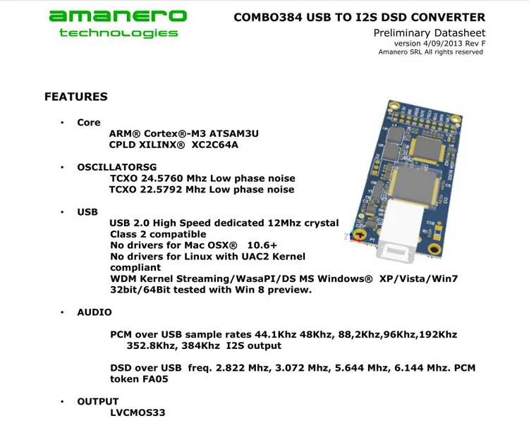 Цветовая классификация A: стандартная версия конфигурации B: улучшенная версия op amp Примечание: Интерфейс Amanenero самостоятельно производится магазином, и чип-решение такое же, как настоящий цифровой интерфейс Amanero. Обратите внимание, что бренд не Amanero, но использует аналогичное решение для чипов, но тот же драйвер. Модуль USB не может обновить прошивку без авторизации. После того, как прошивка будет очищена, прошивка не будет мигать через официальные инструменты. Магазин не несет ответственности за любые проблемы. Спасибо за понимание! Интерфейс Amanero + Плата декодера ES9038Q2M Система поддержки: 1: WIN7, WIN8, WIN10, (необходимо установить драйвер, Предоставленный нами) 2: Native MacOS использует собственный драйвер системы Поддерживаемая Частота выборки: Комплект: 16/24/32 бит 44,1/48/88,2/96/176,4/192/352,8/384 кГц DSD: 64/128/256 Вход питания: интерфейс USB B (квадратный порт) (кабель для принтера)/адаптер питания постоянного тока 5 В-9 В (источник питания USB и сигнал I2S были подключены, также возможна Подача питания без внешнего источника питания) Регулировка громкости: компьютерная Настройка, две кнопки громкости на плате декодера Выход: 3,5 мм разъем для наушников Держатель Примечание: без кабеля принтера (USB A папа к USB B Мужской кабель), звук декодера будет отличаться, если кабель отличается, пожалуйста, купите его самостоятельно, спасибо за понимание! Иллюстрация в деталях: 1: PCB принимает Двухслойный дизайн процесса погружения золота для обеспечения хорошей проходимости больших и малых токов 2: высококачественный генератор активных кристаллов 3: имеет свою собственную программу разработки, полную оптимизацию чипа, лучшую целостность сигнала и меньшее искажение сигнала 4: используйте двойные ОП А, которые используют положительные и отрицательные двойные источники питания (фиксированное напряжение, невходное напряжение) 5: MCLK ES9038Q2M-это независимые часы 100 м 6: чип преобразования напряжения адаптера питания LT1763-это микромощность, низкий уровень шума, Регулятор низкого выпадающего напряжения. Способен обеспечить выходной ток 500мА и дифференциальное напряжение 300мв 7: привод: //pan.baidu.com/s/15qcQu958uv7cHyItbvAehQ Код извлечения: gf9j Официальный драйвер веб-сайта: //www.amanero.com/drivers.htm 8: две платы в комплекте имеют одинаковый размер, оба 68,5*30 мм 9: инструкции по использованию: после установки драйвера включите интерфейс Amanero в качестве устройства по умолчанию 10: для мобильных телефонов, для поддержки OTG, некоторым мобильным телефонам нужен внешний источник питания. Некоторые музыкальные проигрыватели не совместимы. Как правило, на телефонах Android используются плееры Haiby, а на телефонах Apple-плееры onyo.