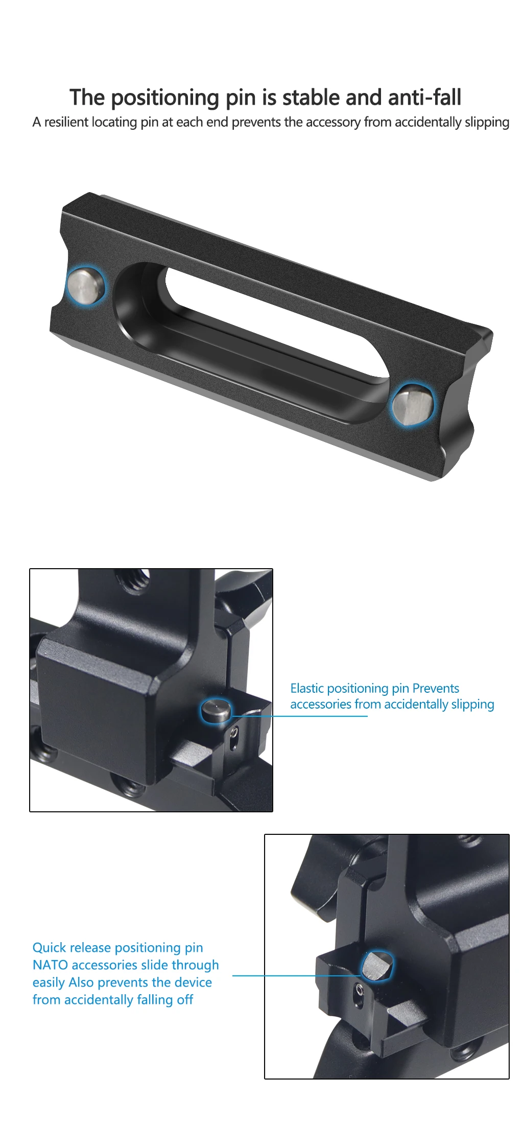 Пружинные булавки разработаны на обоих концах рельсов, чтобы предотвратить падение аксессуаров.