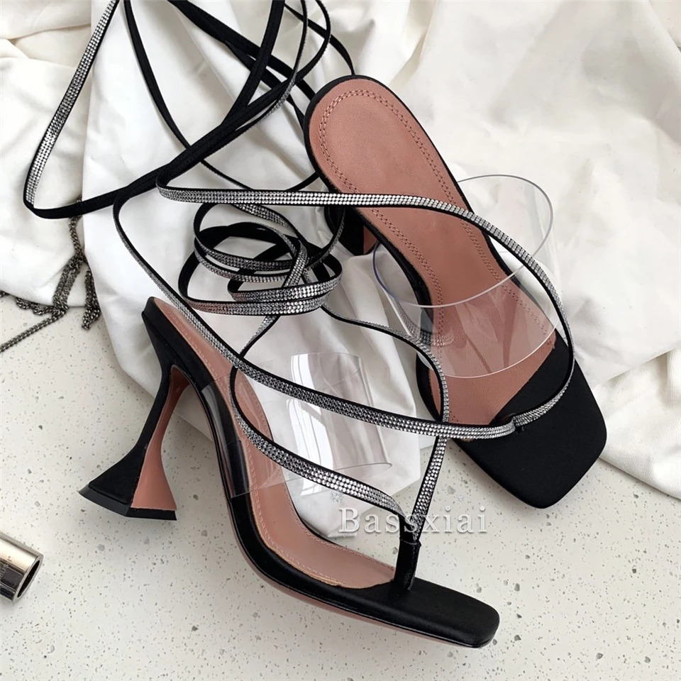 Женские атласные туфли на шпильке с открытым носком и стразами | Обувь