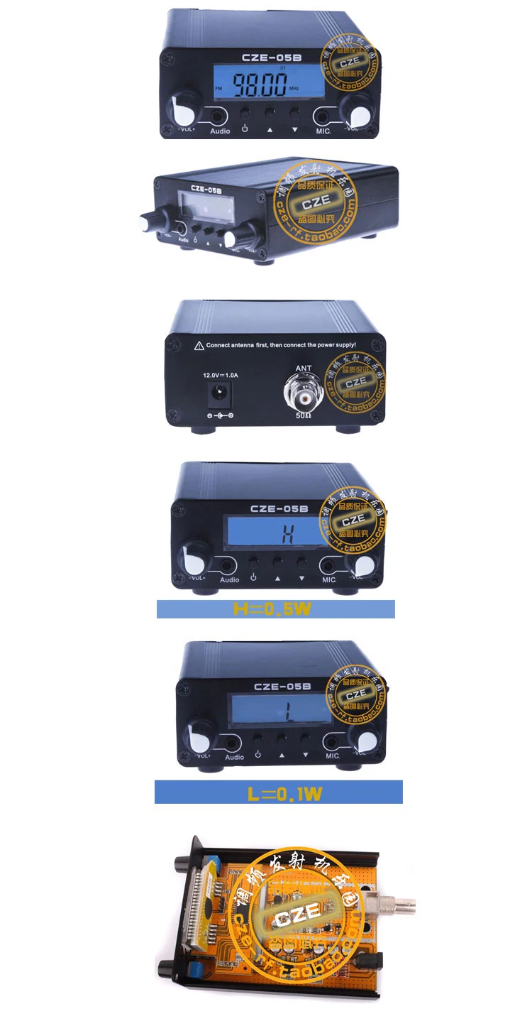 feature: The CZE-05B FM stereo transmitter can be used in factories, schools, supermarkets, farms, offices or to create your own radio station. *Stereo LCD liquid crystal display, 0.1W and 0.5W power can be switched for use; *The frequency can be set arbitrarily within the range of 76M~108M; *Excellent heat dissipation, stable power and excellent sound quality. technical parameter: 1. The overall size of the host: 11.3×8.8×3.8 (mm) 2. Power supply: 12V DC 3. Working current: <0.5A 4. Frequency range: 76-108Mhz (customized 70-98MHz, delivery time takes more than 7 days) 5. Frequency step: 0.1MHz 6. Frequency stabilization method: phase-locked frequency synthesis 7. Modulation method: FM stereo 8. Frequency deviation: +/- 75KHz 9. Pre-emphasis delay: 50us 10. S / N (stereo):> 40db 11. Stereo separation: -45dB (5000Hz~15000Hz) 12. Frequency response: 40KHz~15KHz±0.2dB (stereo) 13. Distortion: <0.3% 14. Modulation degree: 15% 15. Input level: -15dBV 16. RF output impedance: 50Ω 17. Reference range: 200m—500m