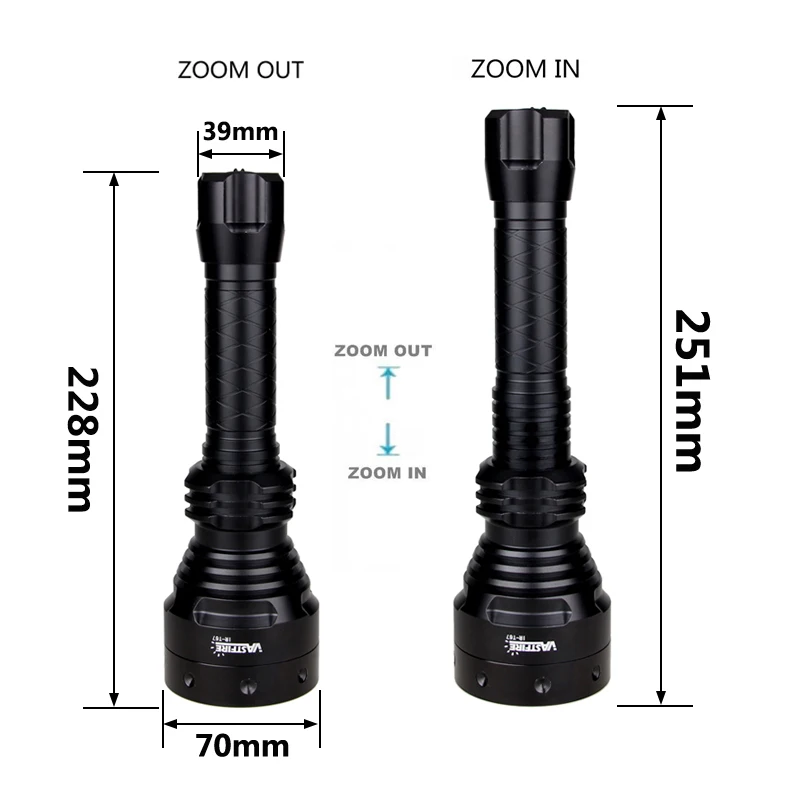 * Невидимый ИК светильник: VASTFIRE T67 не является обычным флэш-светильник с белый светодиодный для общего светильник ing цели. Используя Oslon инфракрасный светильник, черный 850nm светодиодный излучатель, VASTFIRE T67 излучает Невидимый, но высокомощный ИК-светильник с более чем одним Ваттом оптической мощности. Пожалуйста, остерегайтесь, что: вы не увидите ни один светильник с вашими голыми глазами (только маленький и слабый красный свет на светодиодный, чтобы показать вам, что фонарь включен). * Дальнее освещение: VASTFIRE T67 использует Черный Инфракрасный светодиодный OSLON IR-самый маленький и современный инфракрасный светодиодный индикатор с высокой эффективностью, низкой термостойкостью и более одного ватта оптической мощности. T67 может производить мощный удар с диапазоном около 200 метров (прибл. 218 ярдов) с фокусированным лучом. С микросхемы по новейшей технологии, встроенным объективом и отличным посылка, срок до 50000 часов могут быть легко можно получить. * Асперическая линза: Поворотная фокусировка объектива 67 мм обеспечивает возможность фокусировки для плотного прожектора или обратной подсветки для эффекта потока, особенно для дальних освещений. T67 может освещать гораздо дальше сфокусированным лучом, по сравнению с освещением без фокусирующих функций. • Питание от 2x18650 батареи или 2 х 26650 батареи: с рабочее напряжение 7,4-8,4 V, пожалуйста, тщательно выберите 18650 или 26650 с подлинным ядром, так как на рынке много батарей с поддельными ядрами и ненадлежащим качеством. При использовании определенных поддельных 18650 или 26650 батарея имеет выходное напряжение ниже, чем 3,7 V, при этом она не будет достаточно, чтобы активировать VASTFIRE T67. (не включая батарею) * Корпус и память режима: корпус изготовлен из авиационного алюминиевого сплава. Диаметр корпуса: 30 мм. Подходит для любого кольца 30 мм и крепления. Вес нетто: 510 г. Длина: 222 мм. 1 Режим системы от High