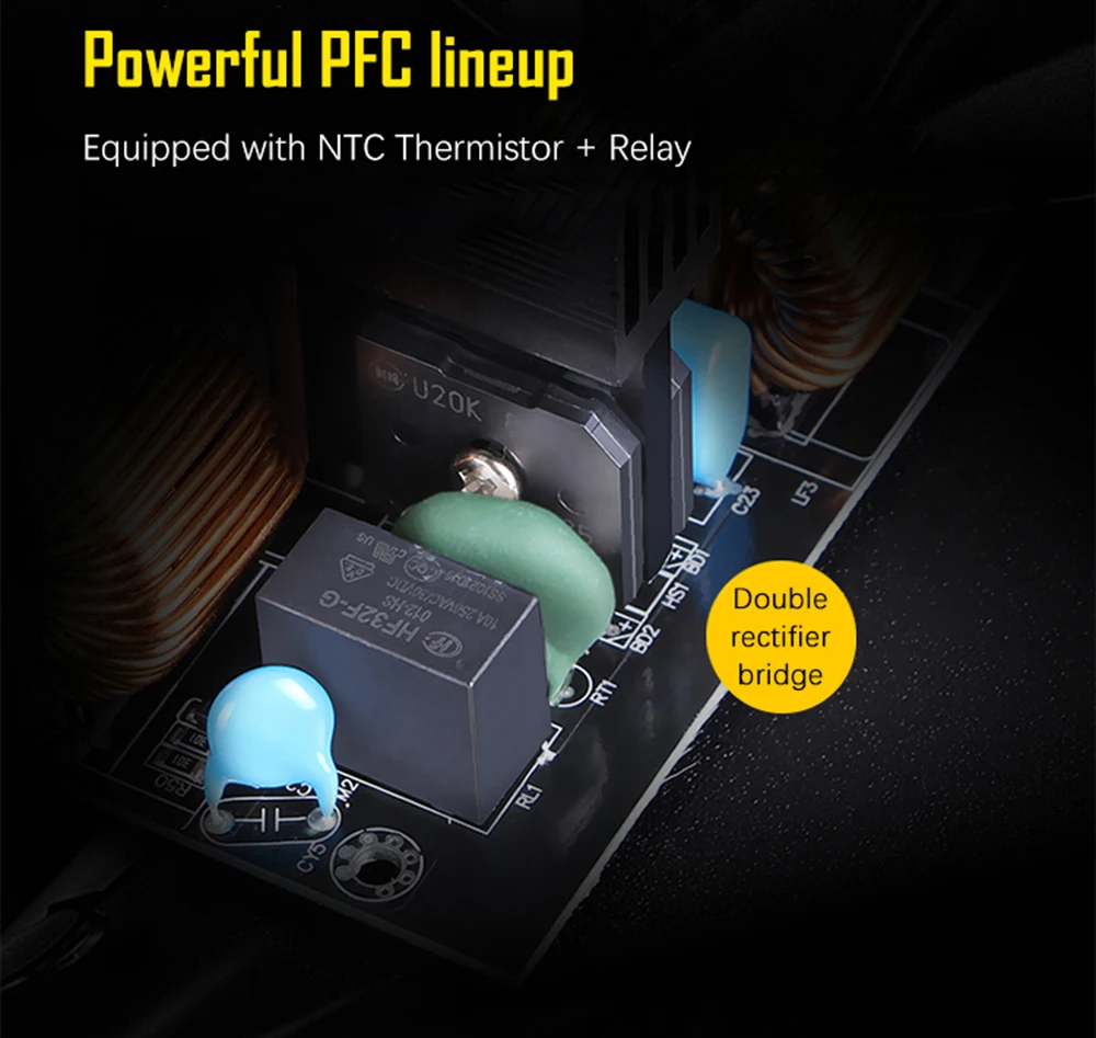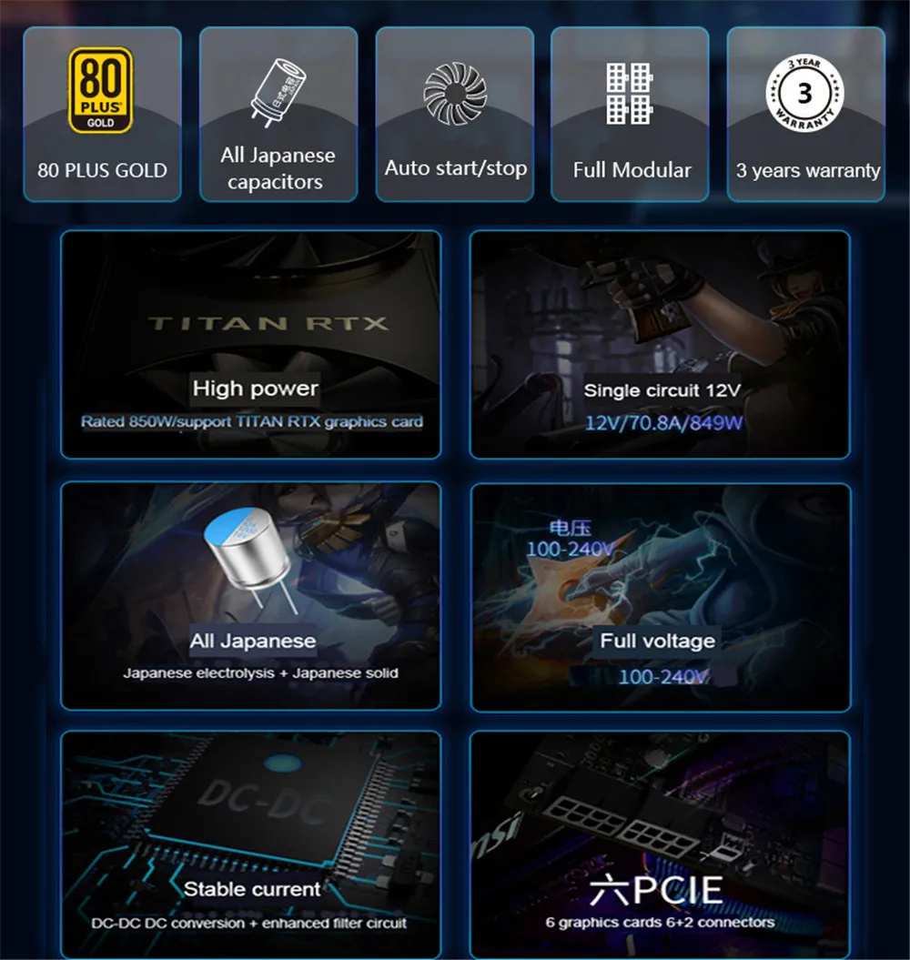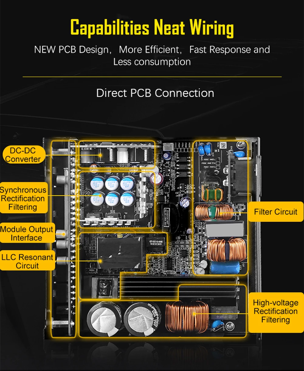 -Японский основной конденсатор + твердый конденсатор -ООО резонанс + DC-DC + синхронное выпрямление -5V/3,3 V DC-DC, более стабильный ток -EMI + NTC + реле, мощный и надежный -PCB 3,3 V японский твердотельными конденсаторами, стабильное напряжение и хорошее качество -Полностью модульный, Позолоченный разъем, пользовательский плоский провод -80 плюс золото, близко к платине и энергоэффективность до 91.78% -12 В, свободно адаптируется к высококлассному ЦПУ и графике
